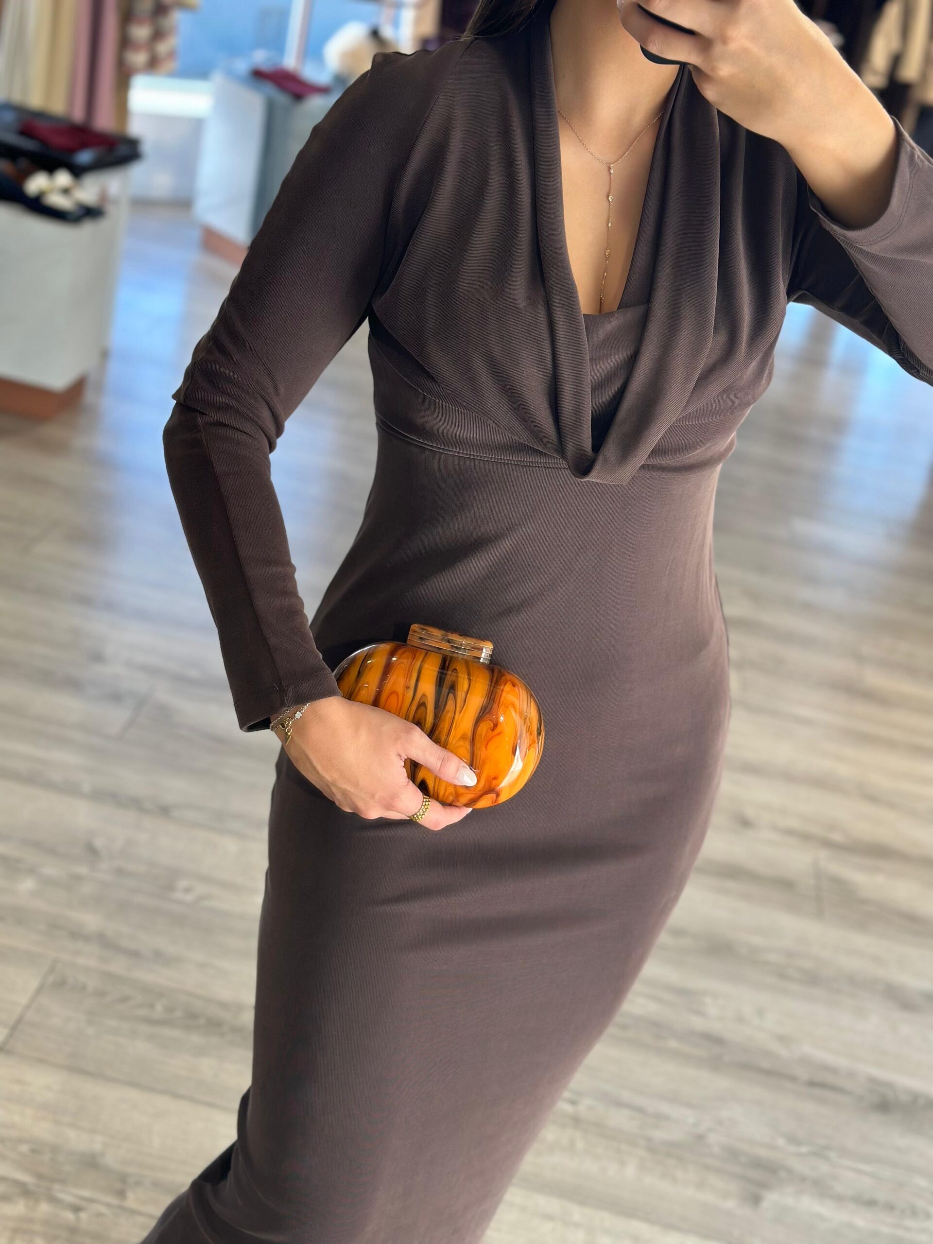 Ideal para jantares, eventos ou ocasiões especiais, este vestido pode ser combinado com sandálias de tiras finas ou botins de salto para um visual moderno e refinado. A cor castanha, versátil e atemporal, permite coordenados tanto de outono como de inverno.
