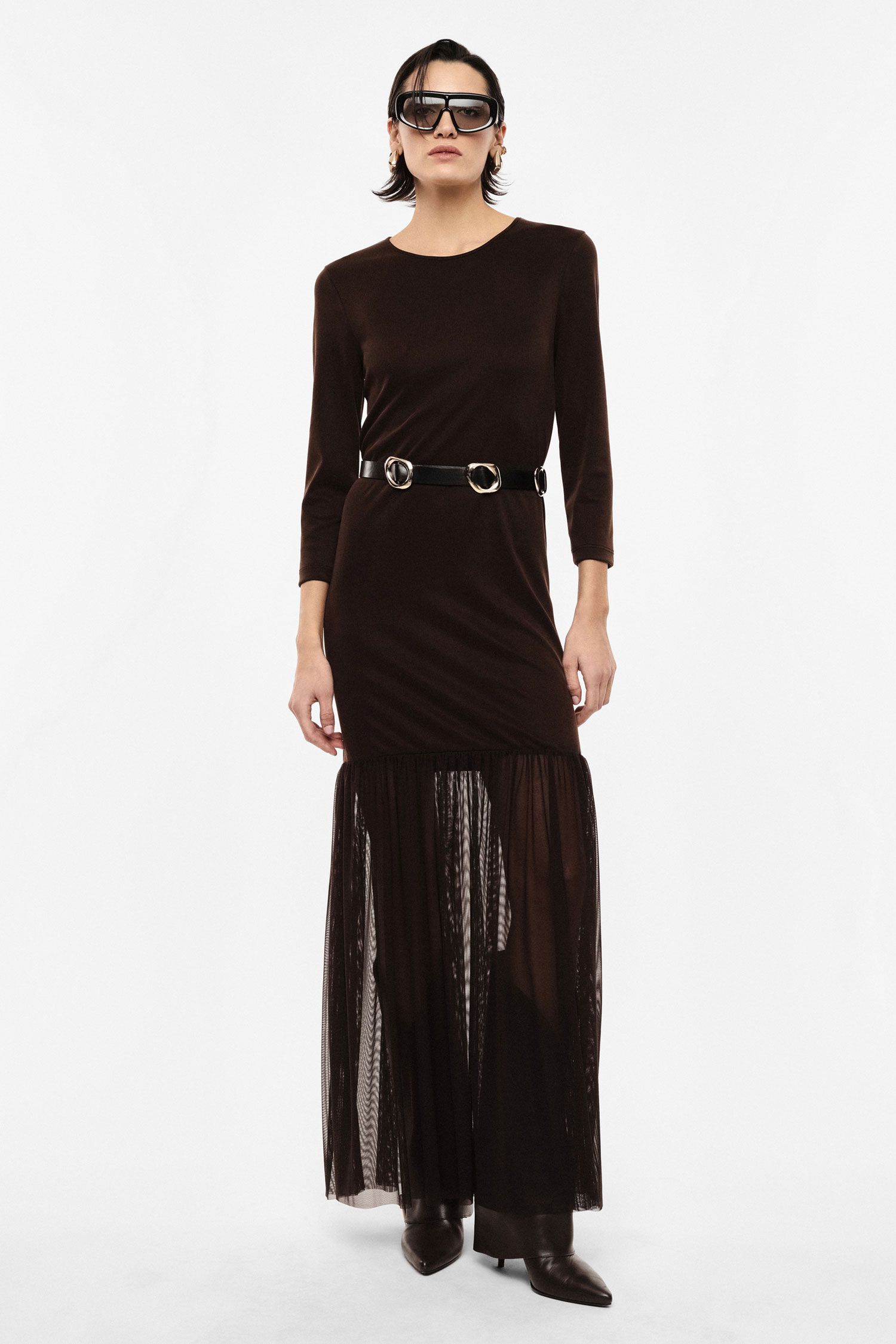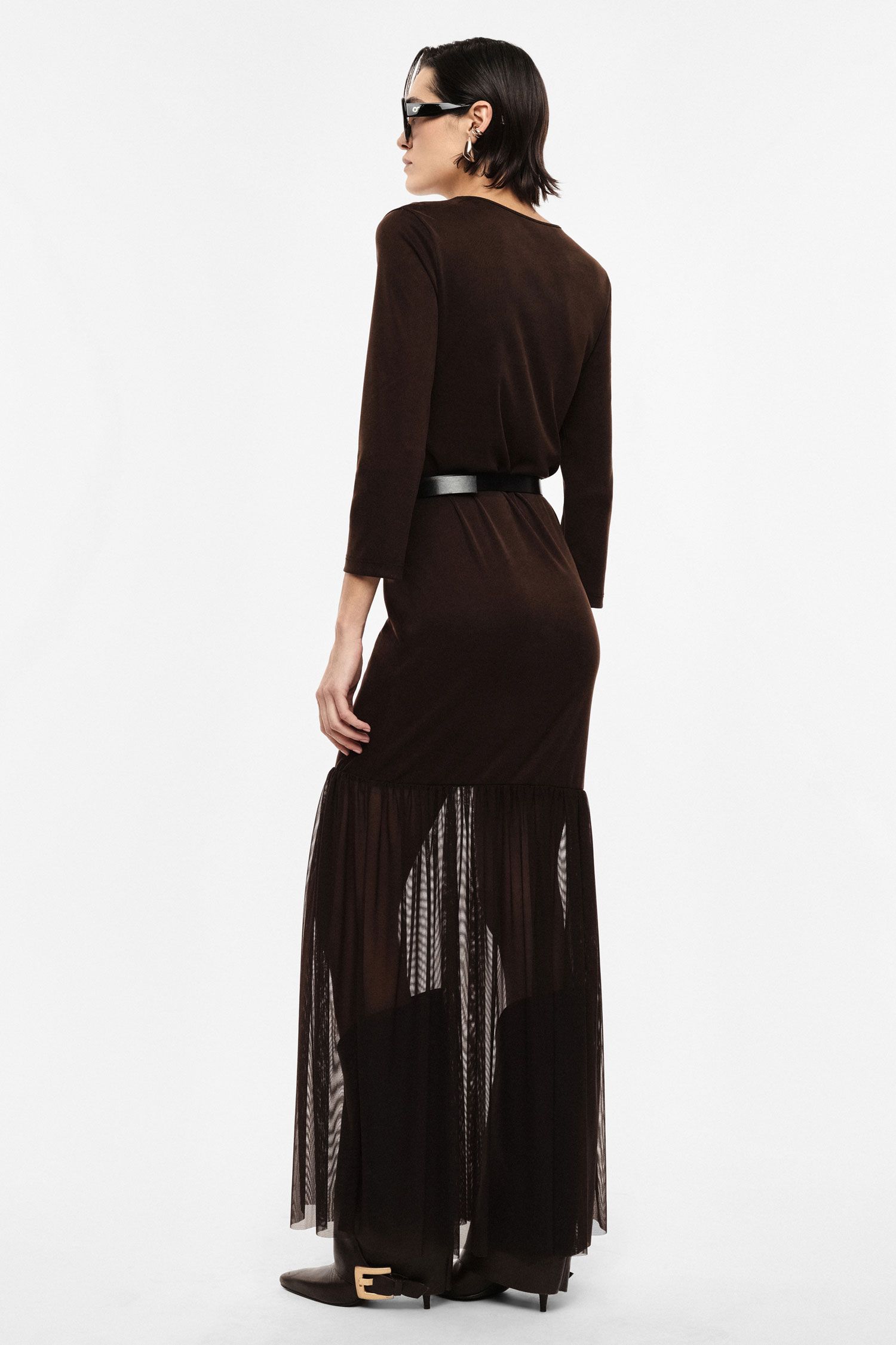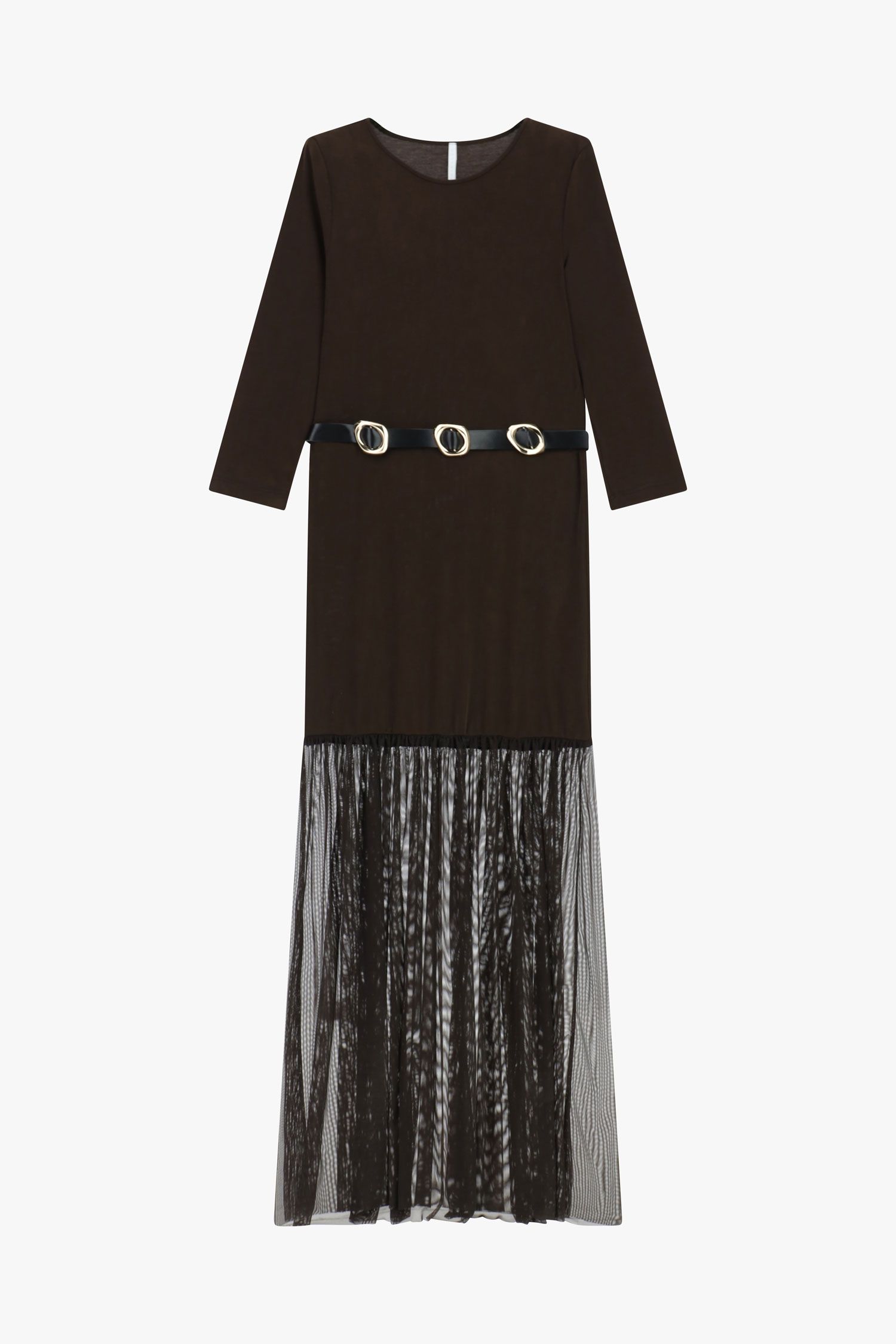 VESTIDO CASTANHO COM DETALHE DE TULE E CINTO IMPERIAL