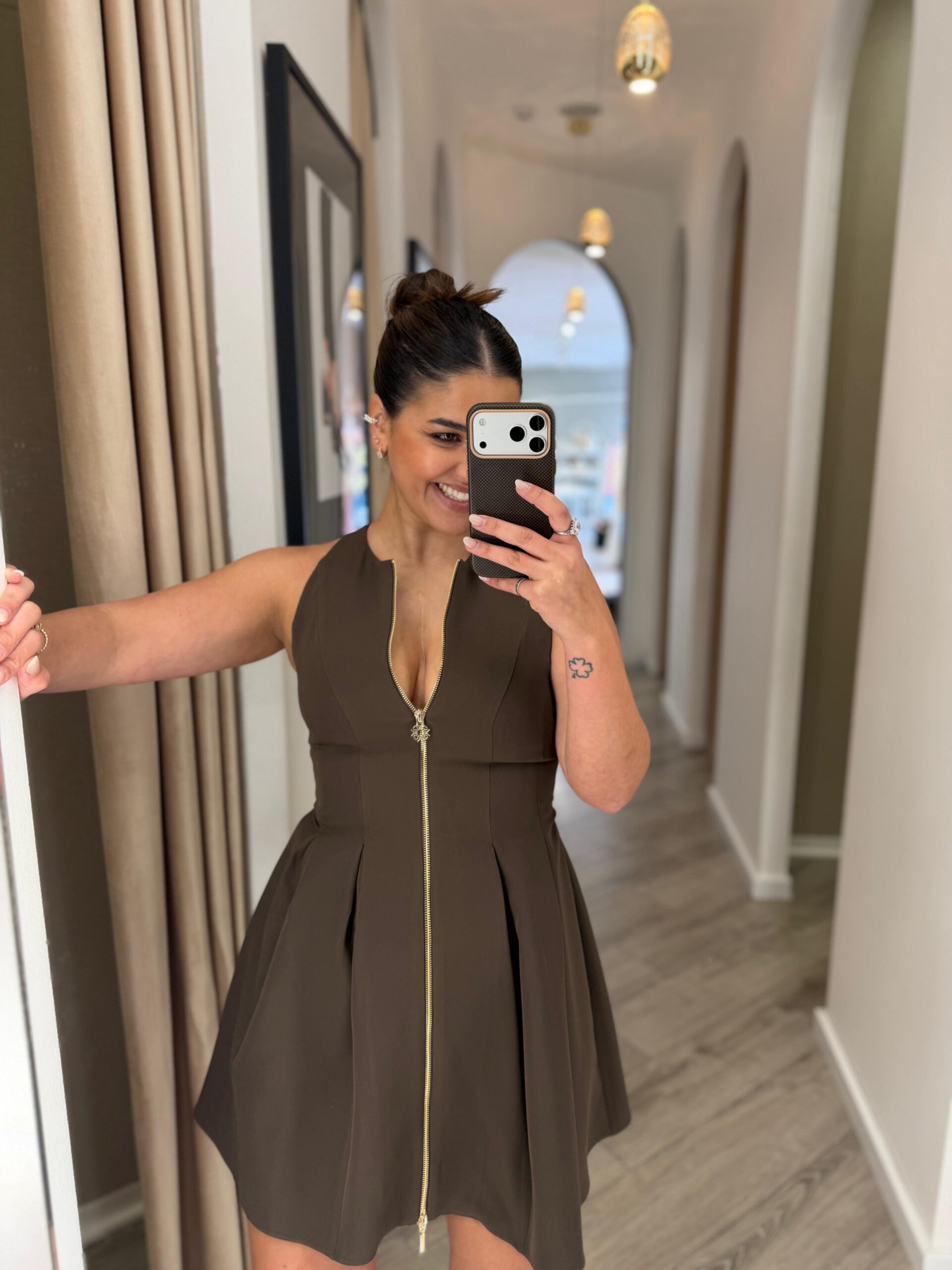 O modelo sem mangas apresenta decote redondo e um fecho frontal dourado que percorre toda a peça, criando um detalhe moderno que contrasta subtilmente com o tom castanho profundo do vestido. As pregas na saia acrescentam movimento e fluidez, enquanto os recortes na zona da cintura ajudam a definir a silhueta de forma elegante.
