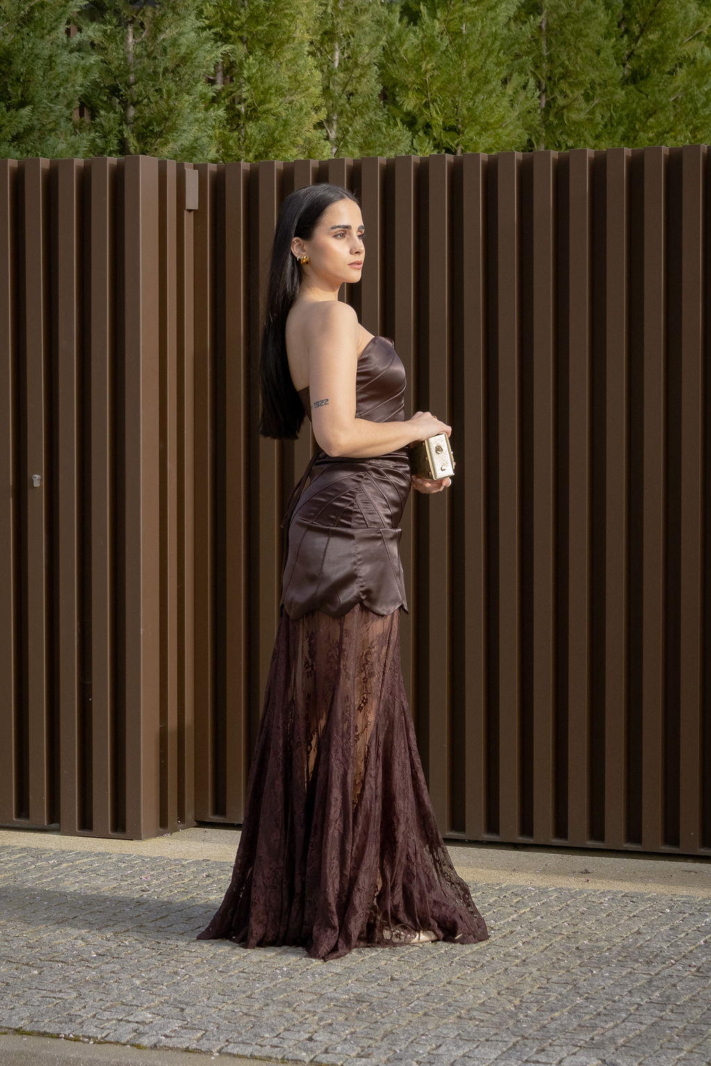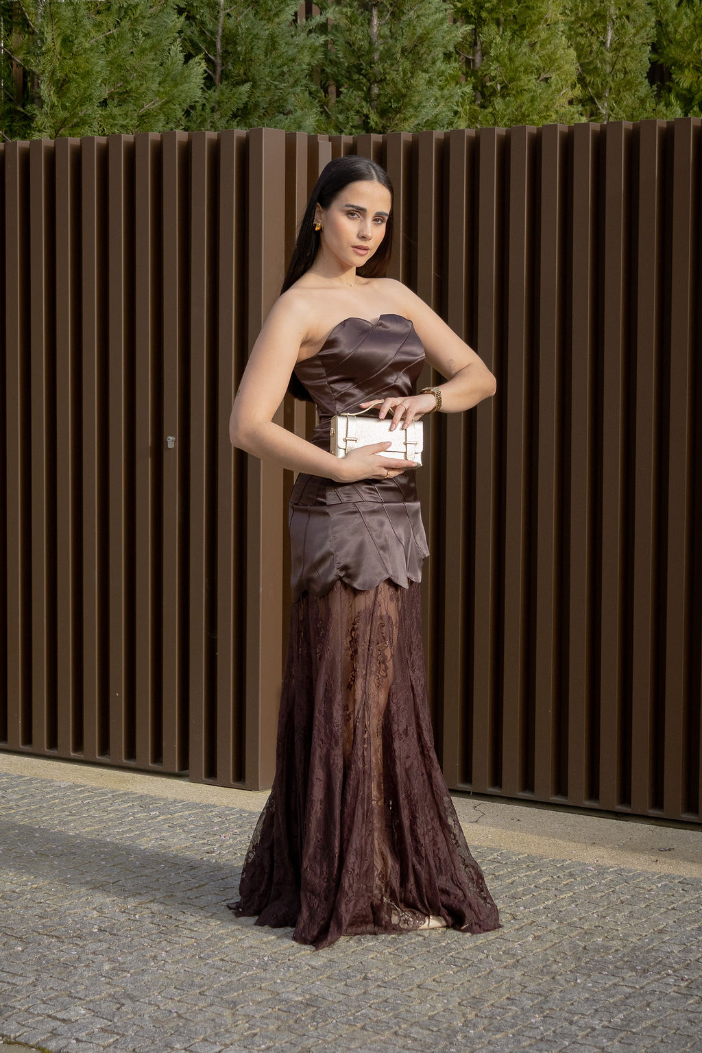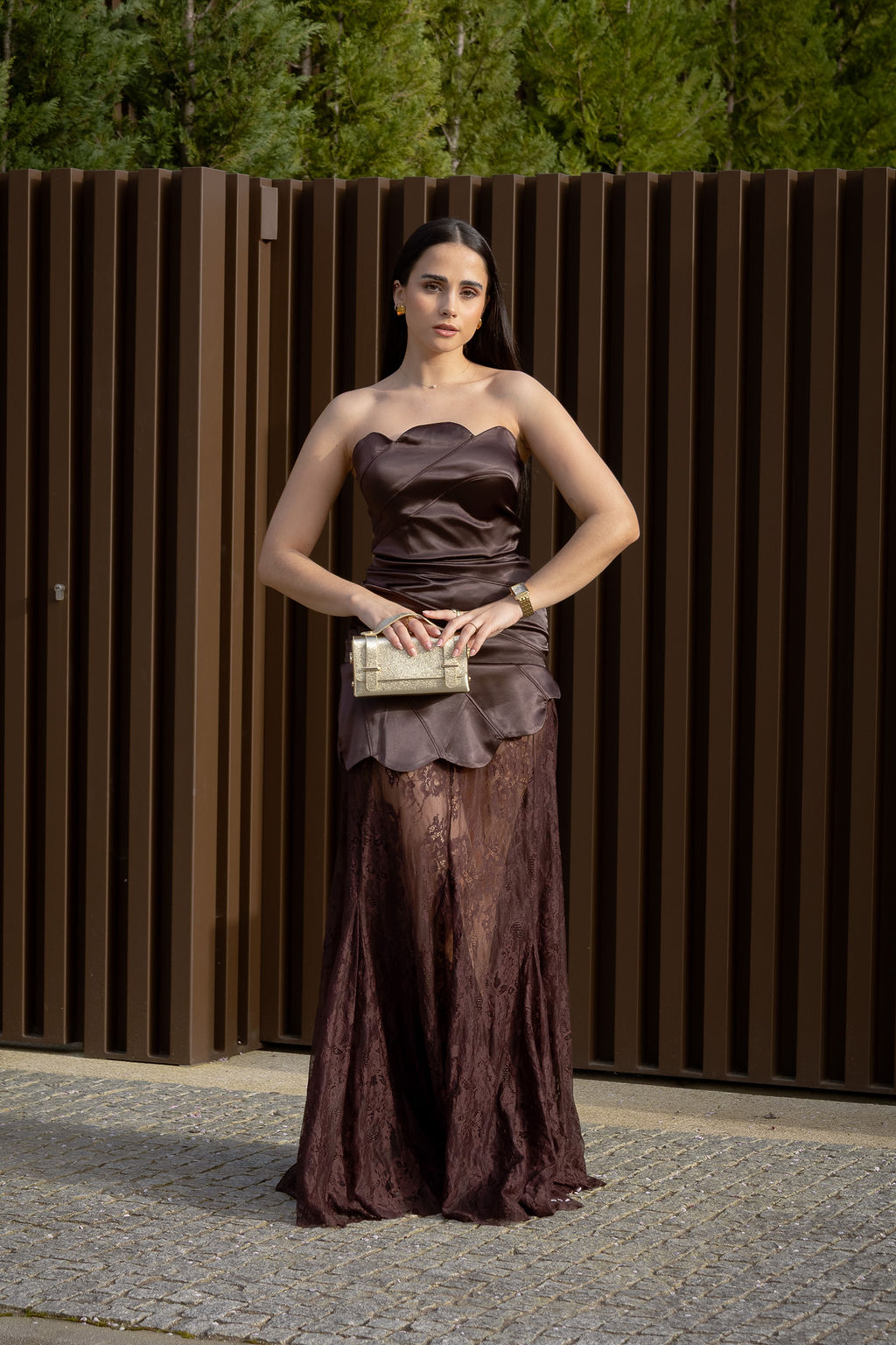 Vestido em tom castanho profundo com acabamento acetinado que confere sofisticação e luminosidade à peça. O corpete estruturado valoriza a silhueta e apresenta recortes orgânicos que desenham o corpo de forma elegante, criando um efeito visual muito feminino e contemporâneo.