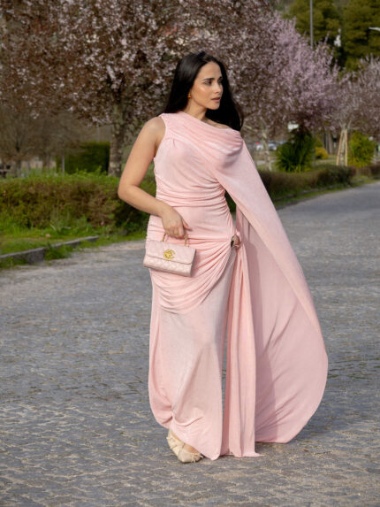 VESTIDO ROSA DRAPEADO COM DETALHE METÁLICO PONTO CHIC
