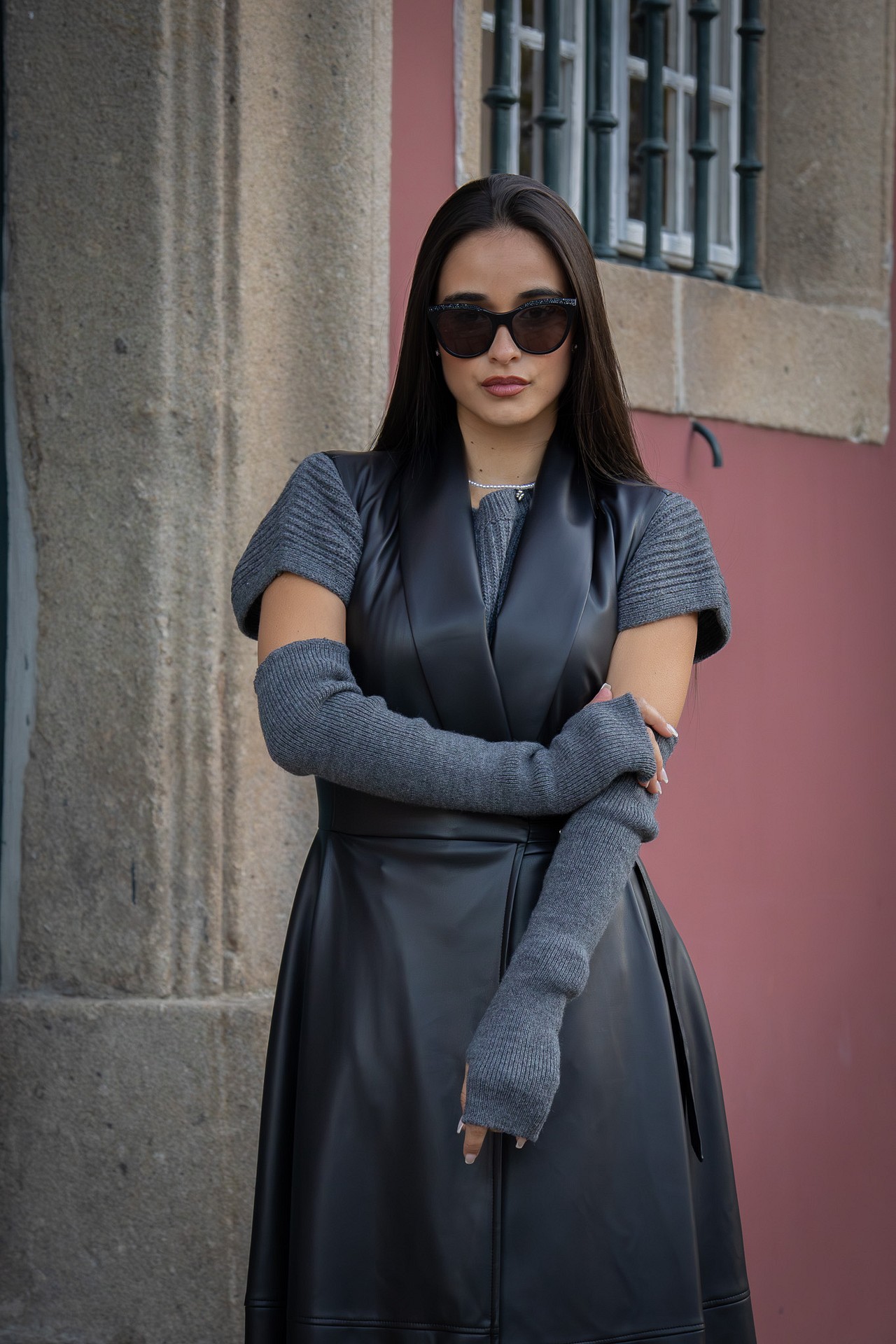 O vestido colete preto em efeito pele da Imperial é uma peça statement que combina ousadia, modernidade e elegância. Com um visual contemporâneo e sofisticado, destaca-se pela silhueta longa e pelo brilho subtil do revestimento, criando um look forte e refinado.