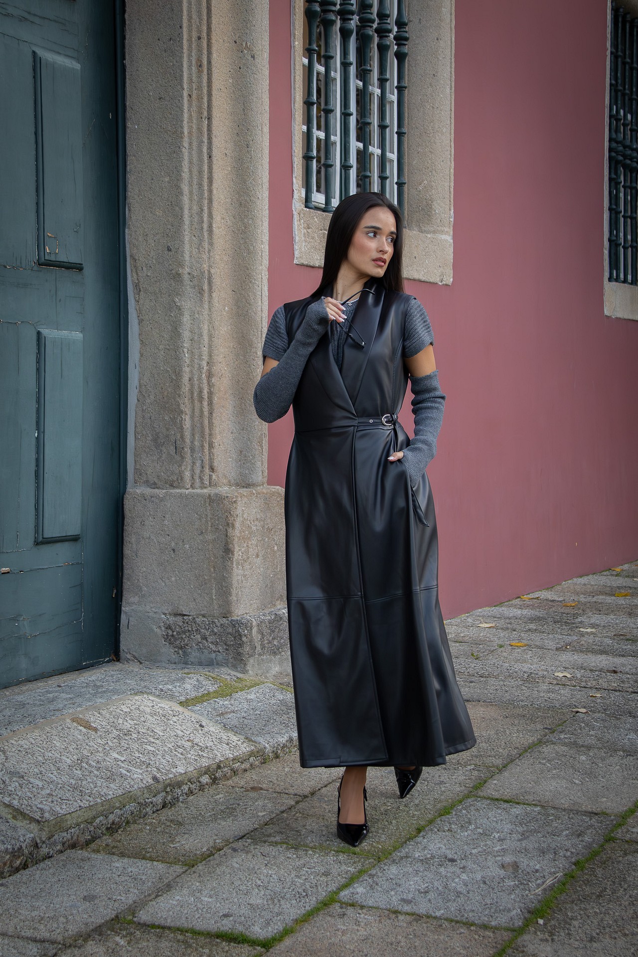 O design inclui gola larga, ombros marcados sem mangas e um cruzamento frontal elegante, finalizado com um fecho lateral metálico que adiciona modernidade ao conjunto. As costuras estratégicas definem a silhueta, enquanto o comprimento midi alonga a forma e dá presença à peça.