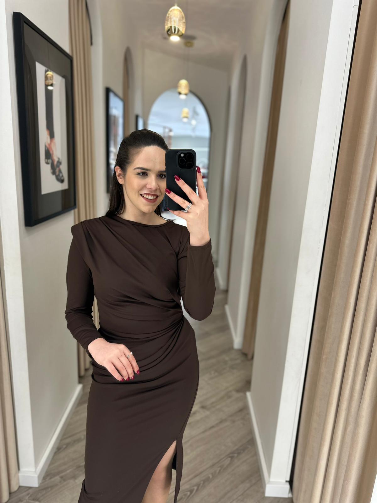 VESTIDO COM DRAPEADO CASTANHO PONTO CHIC