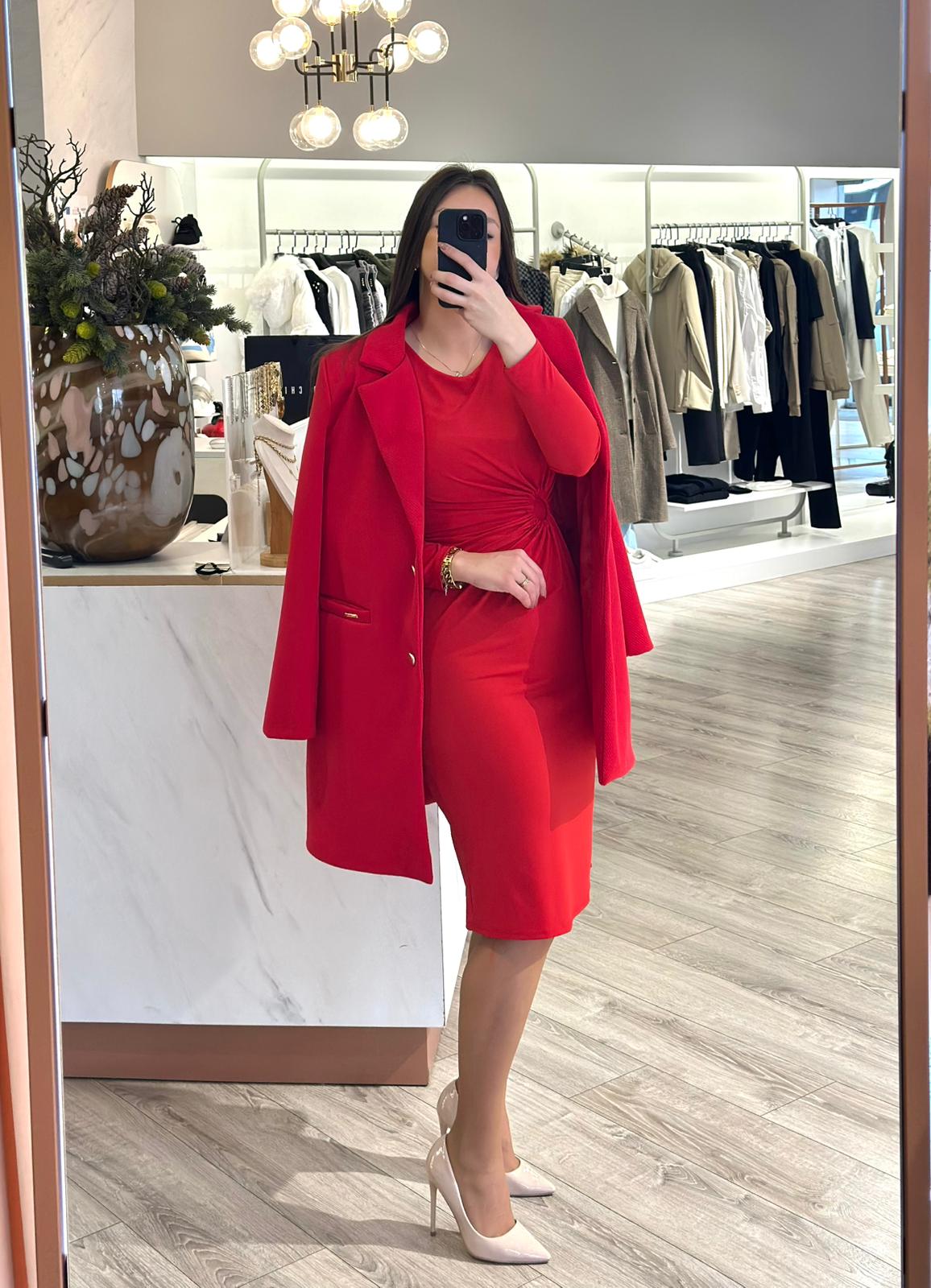 VESTIDO COM DRAPEADO E ARGOLA DECORATIVA VERMELHO PONTO CHIC