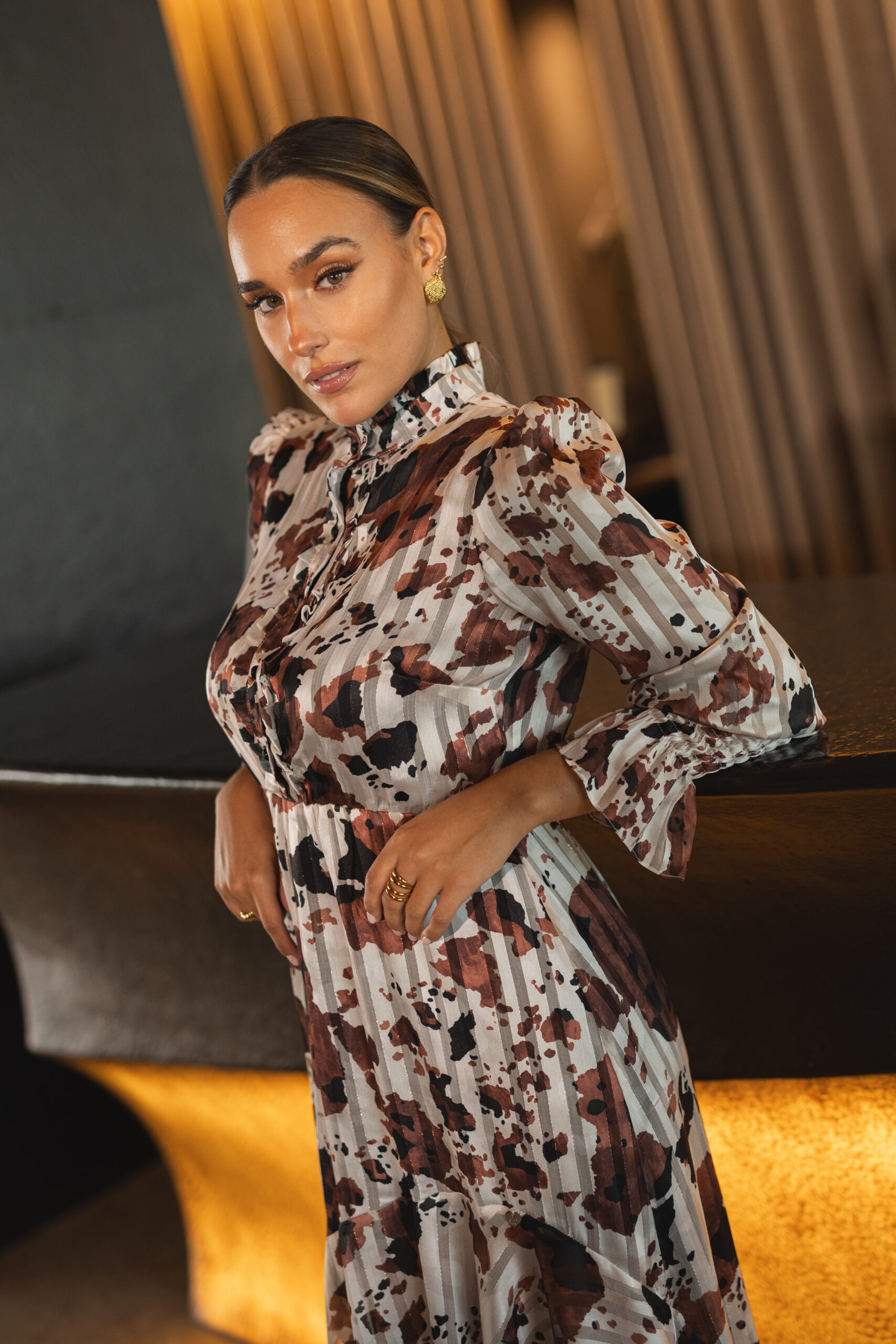 O vestido comprido da marca Miss You distingue-se pelo padrão abstracto em tons de vinho, preto e creme, que cria um visual moderno e cheio de personalidade. O tecido plissado com riscas verticais subtis em lurex acrescenta luminosidade e movimento elegante.