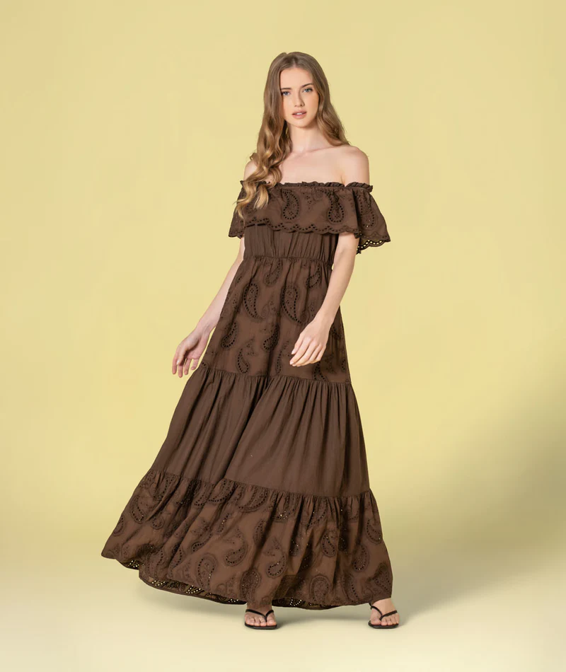 VESTIDO COMPRIDO CASTANHO COM BORDADO INGLÊS RUGA