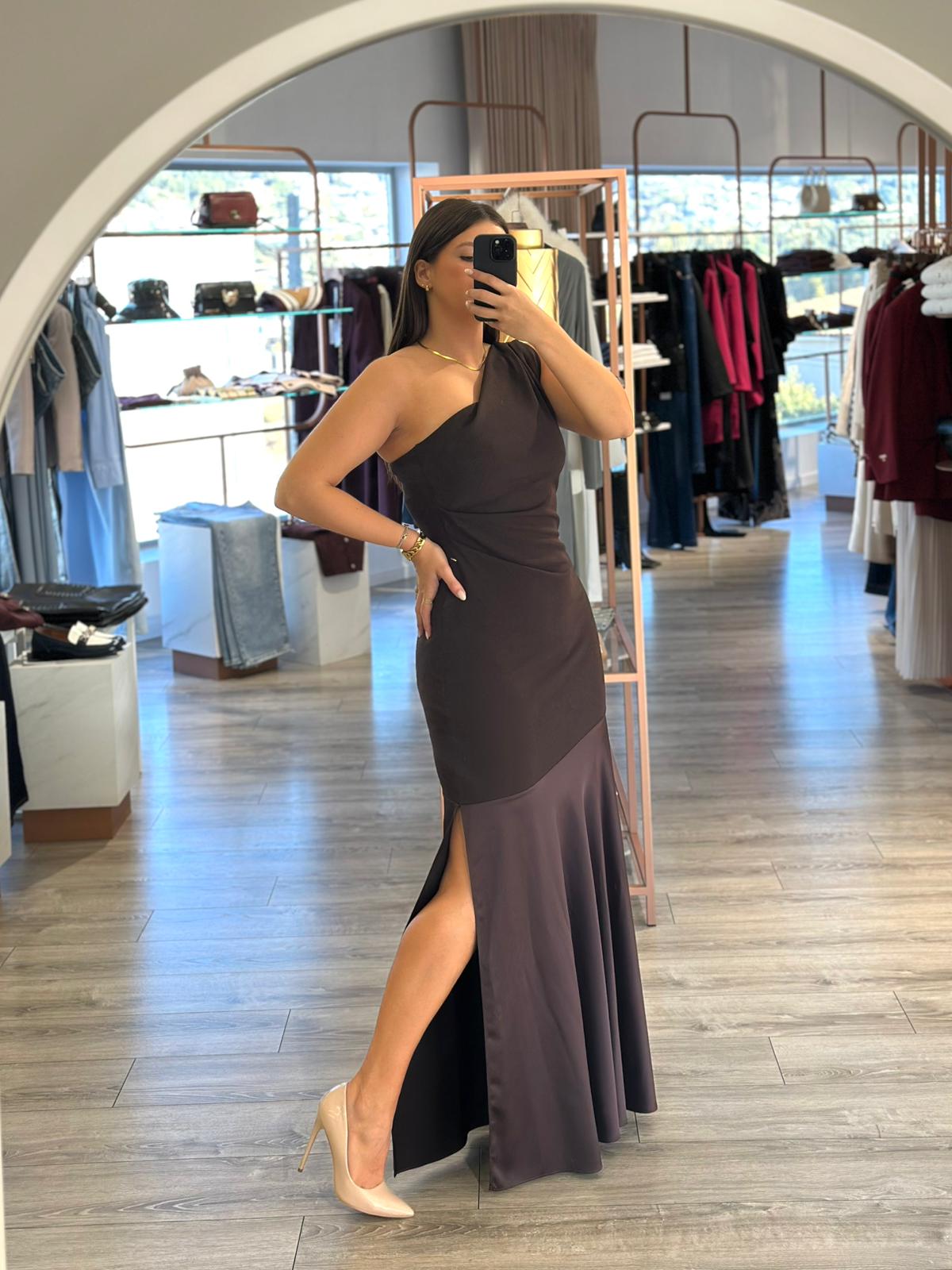 VESTIDO COMPRIDO CASTANHO DE UM OMBRO SÓ RINASCIMENTO
