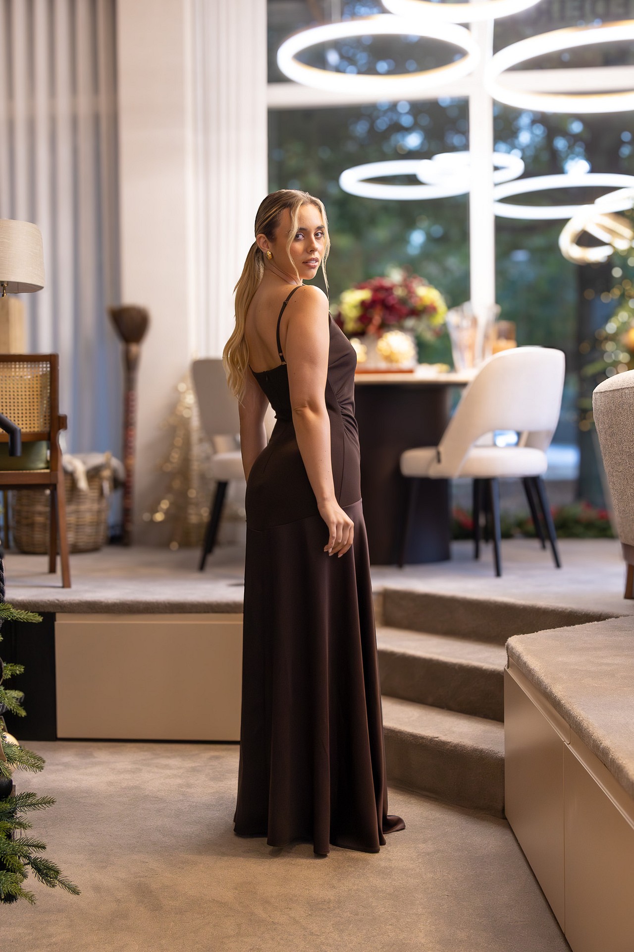 A cor castanha profunda reforça a elegância e versatilidade, podendo ser combinada com acessórios dourados, sandálias de salto ou clutches sofisticadas.