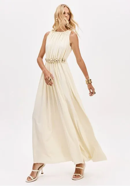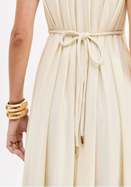 Este vestido super midi da Lança Perfume é a definição perfeita de elegância contemporânea com impacto visual. O design fluido e plissado cria movimento a cada passo, enquanto a silhueta alongada valoriza a figura de forma subtil e extremamente feminina. O detalhe metálico na cintura acrescenta um toque sofisticado e exclusivo, funcionando como ponto de destaque e elevando imediatamente o look.