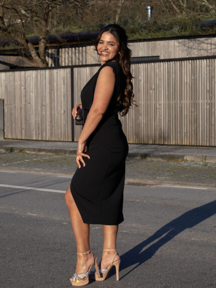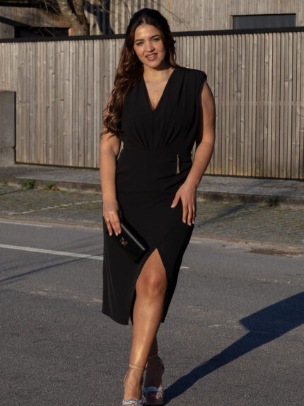 VESTIDO PRETO COM DECOTE PROFUNDO E DETALHE DOURADO RINASCIMENTO