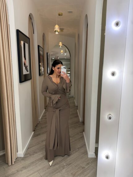 VESTIDO LONGO CASTANHO COM RENDA PONTO CHIC
