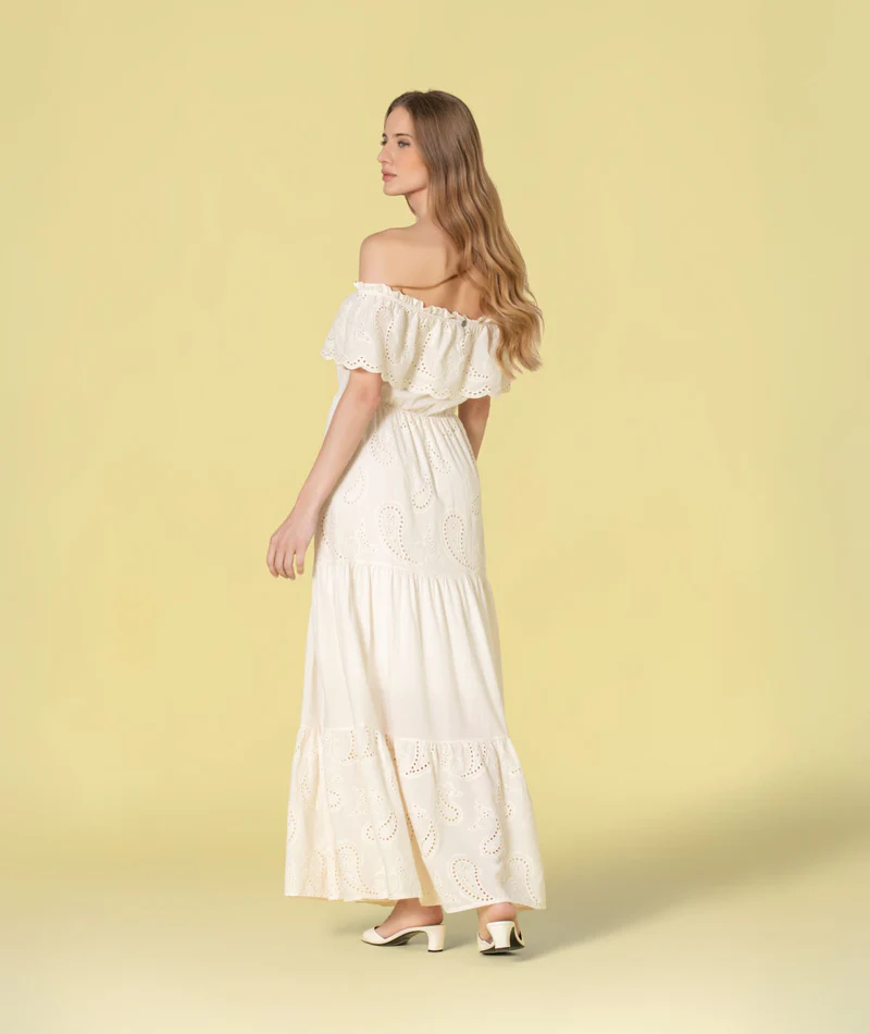 A saia longa desenvolve-se em camadas com pormenores de bordado inglês ao longo da peça, criando textura, movimento e um efeito visual sofisticado. O corte fluido reforça a leveza do vestido, tornando-o perfeito para um estilo descontraído mas cuidado.