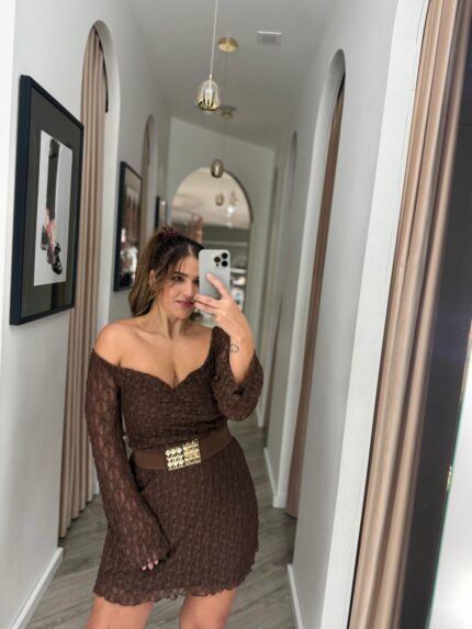 Distinto e versátil, o vestido comprido de renda castanho Ponto Chic pode ser combinado com botas altas ou sapatos de salto, resultando num look sofisticado, moderno e cheio de charme.