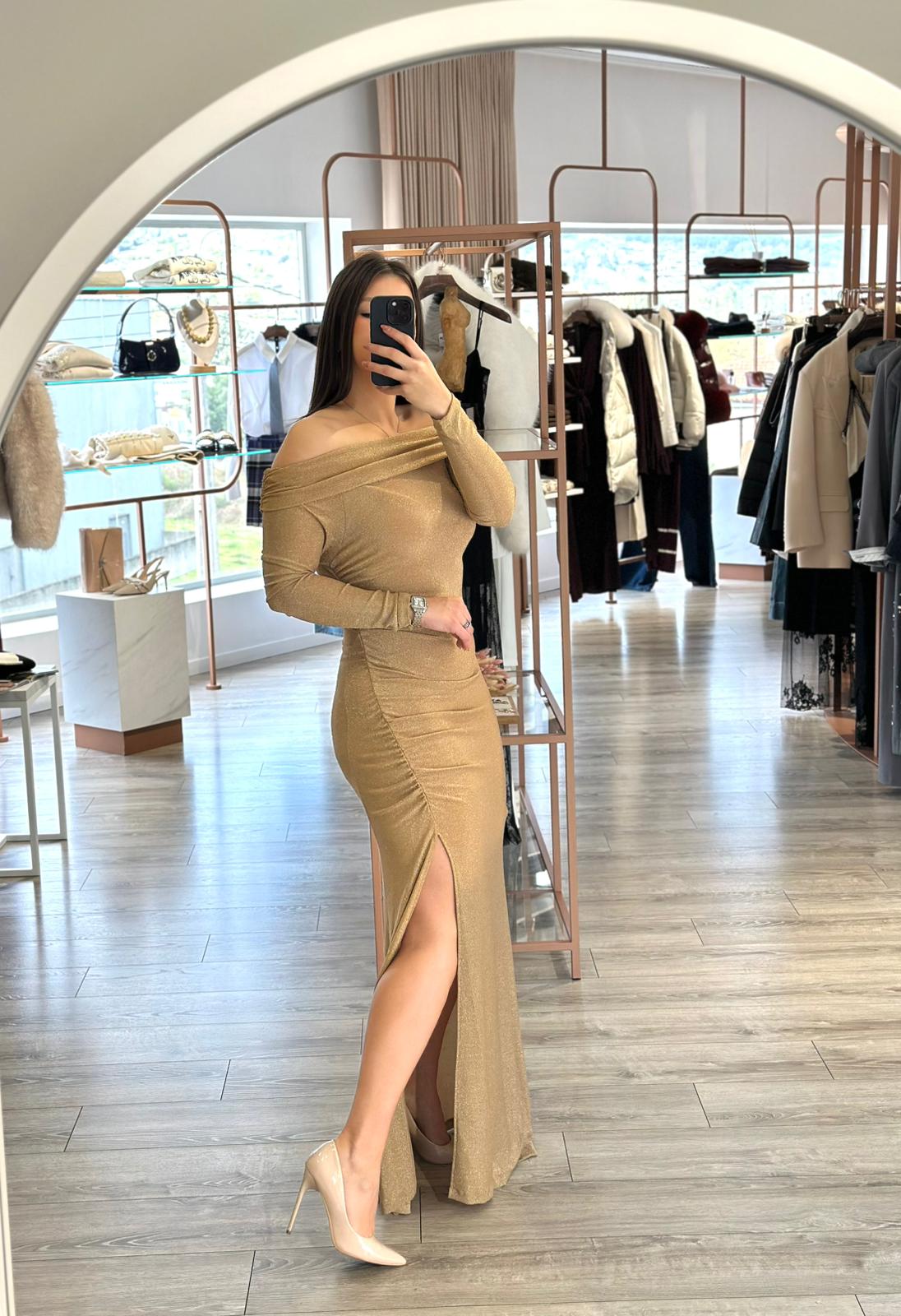 VESTIDO COMPRIDO DOURADO DE MALHA METÁLICA RINASCIMENTO