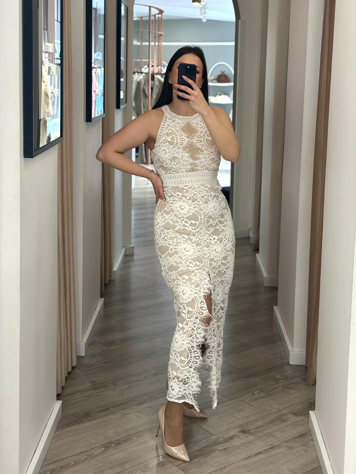 Vestido comprido em renda branca com padrão floral trabalhado, uma peça elegante e sofisticada pensada para momentos verdadeiramente especiais.