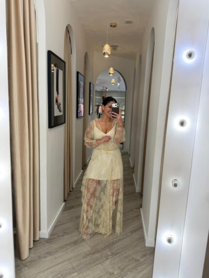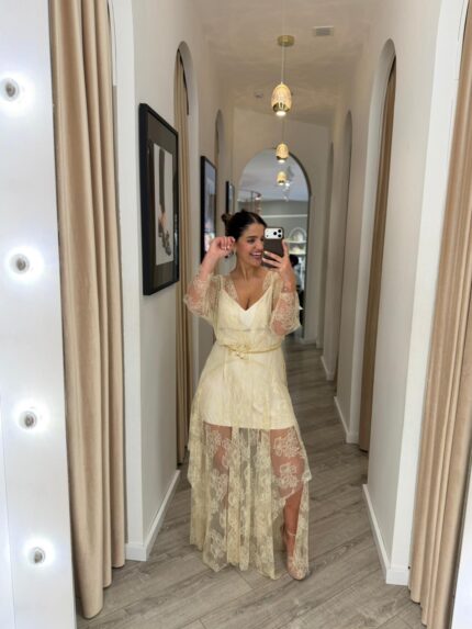 VESTIDO MIDI BEGE OMBRO A OMBRO LANÇA PERFUME