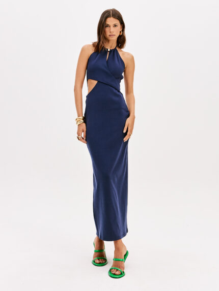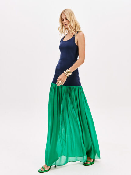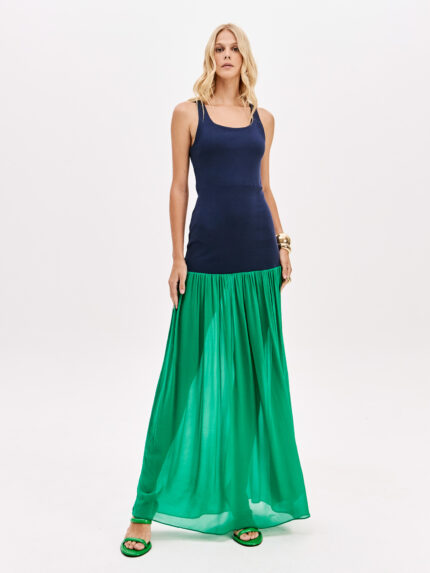 O modelo apresenta um trabalho plissado ao longo de toda a peça, valorizado por um efeito degradé que transita harmoniosamente do azul profundo para o verde intenso, criando profundidade e impacto visual. O decote halter é complementado por um cordão torcido, que permite ajuste no pescoço e acrescenta um detalhe moderno e diferenciador ao look.