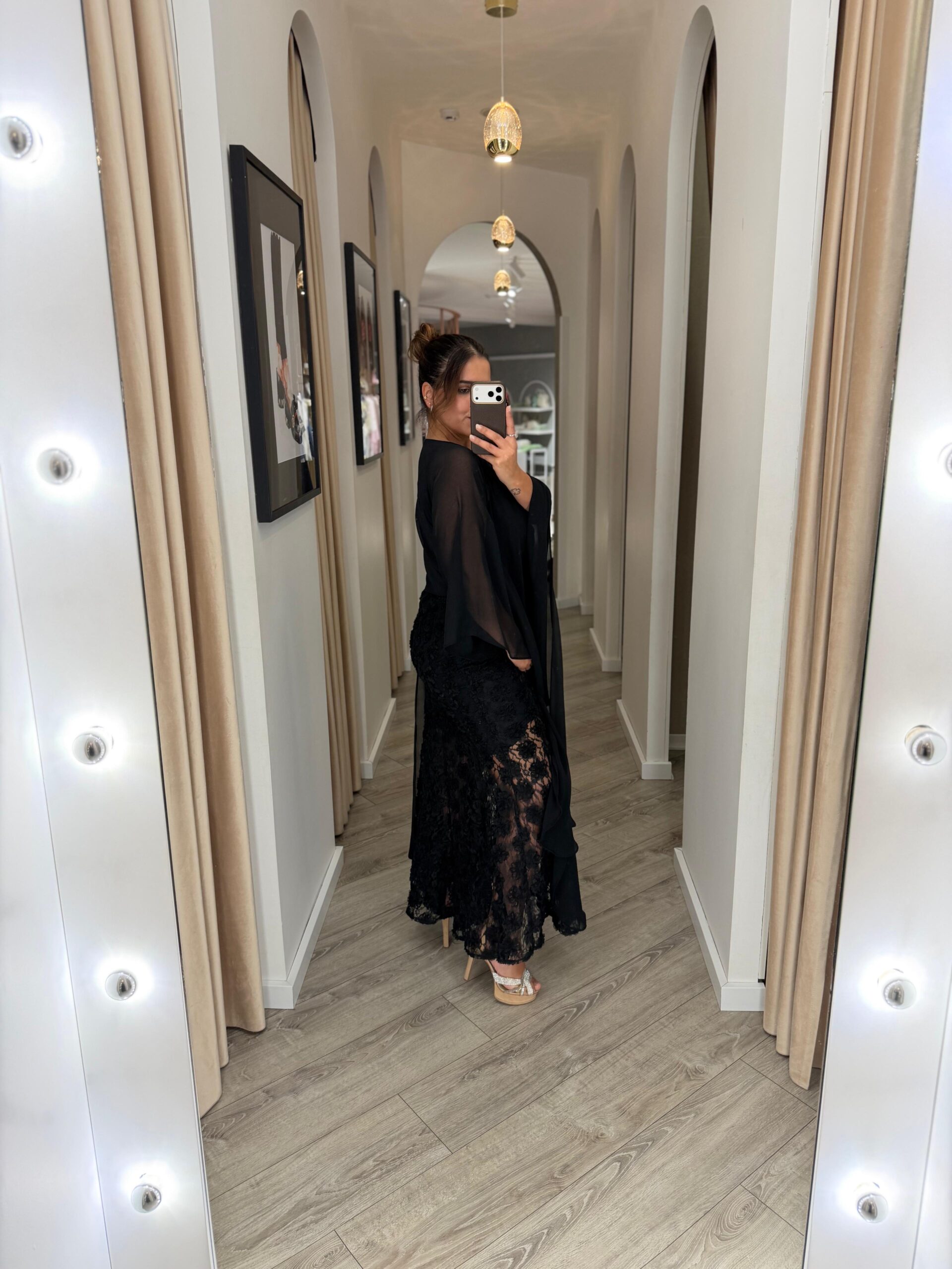 Este vestido comprido preto destaca-se pela sua textura floral em relevo, que cria um efeito tridimensional delicado e extremamente sofisticado. Confeccionado em 100% poliéster, com forro também em 100% poliéster, garante leveza, conforto e um caimento elegante ao longo da silhueta.
