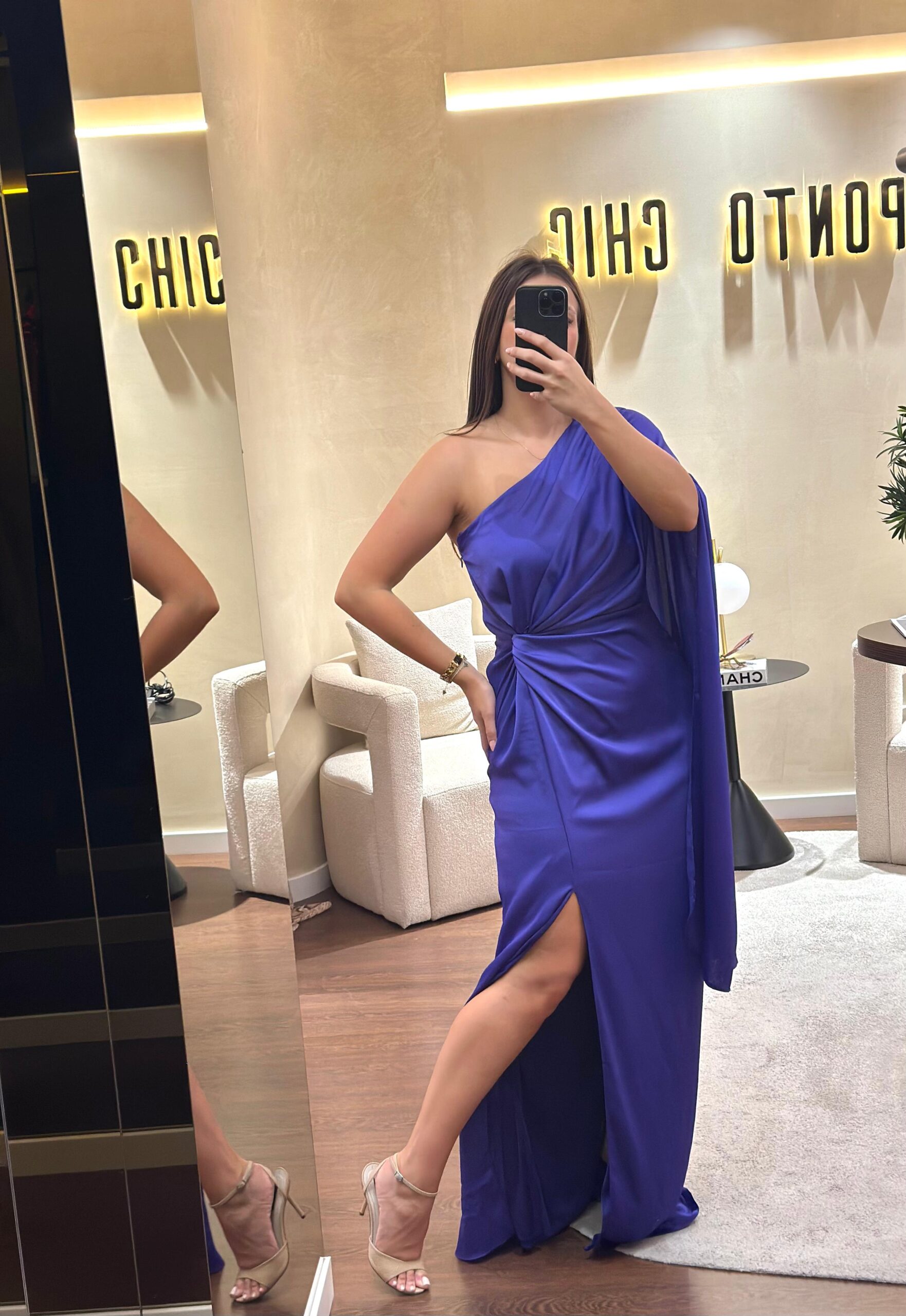 VESTIDO COMPRIDO COM RACHA NA FRENTE. PORMENOR DE NÓ NA CINTURA. MANGA ASSIMÉTRICA UNILATERAL.FECHO INVIISVEL NA LATERAL. 100% POLIÉSTER