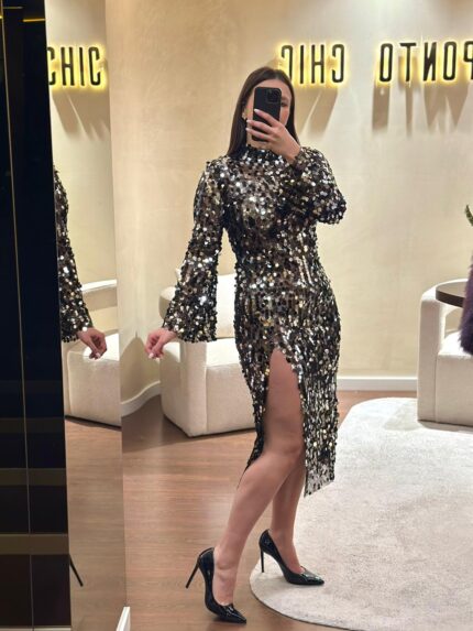 VESTIDO LONGO PRETO DE LANTEJOULAS PONTO CHIC