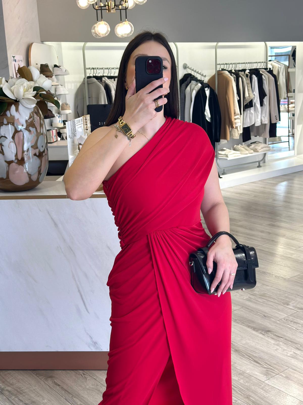VESTIDO COMPRIDO, SAIA ESTILO ENEVELOPE NA RENTE APENAS COM LIGEIRA ABERTURA. SÓ COM UM OMBRO FLUIDO NA PARTE SUPERIOR. FRANZIFO NA LATERAL. FECHO INVIISVEL LATERAL ESQUERDA. 98% POLIÉSTER 2% ELASTANO
