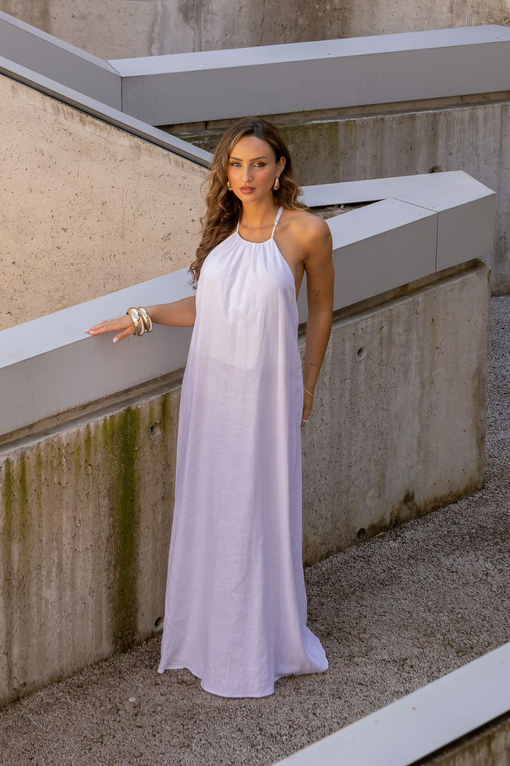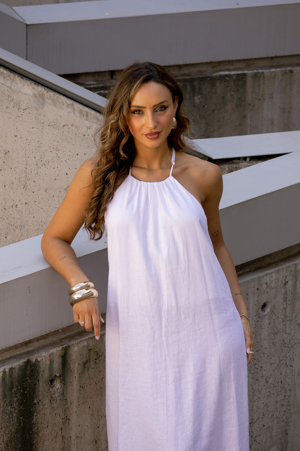 Vestido em tom cru com uma estética leve e sofisticada, perfeito para um look elegante de verão. Confeccionado em tecido com mistura de fibras naturais (55% linho e 45% viscose), garante frescura, conforto e um caimento fluido.