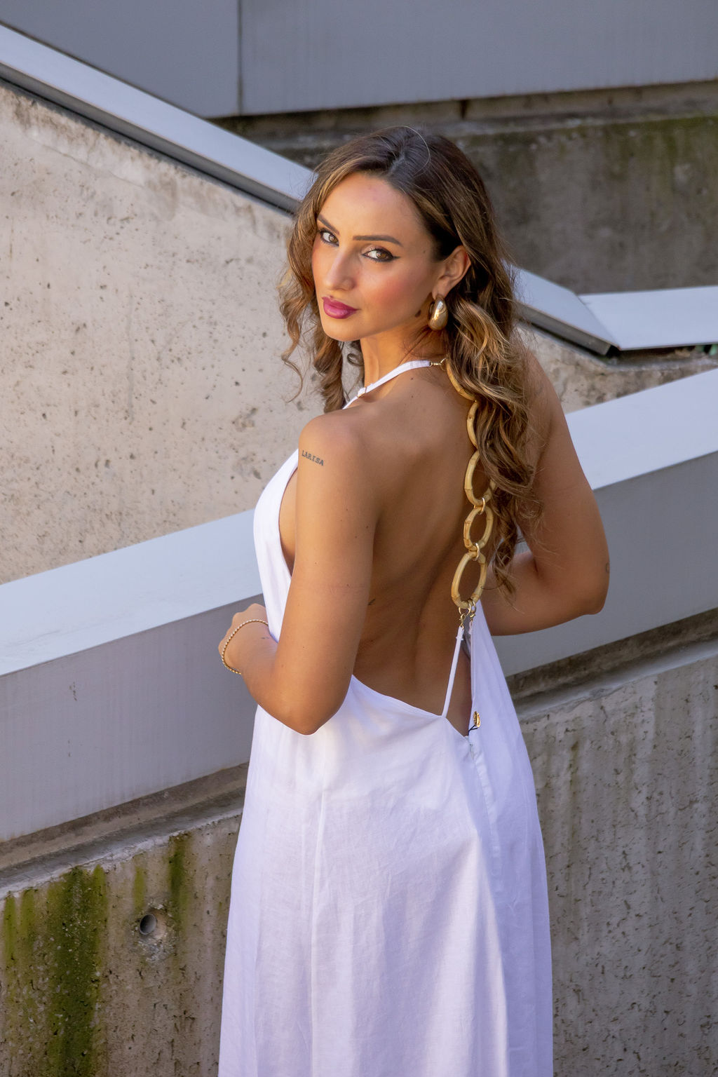 VESTIDO CRU COM ARGOLAS DECORATIVAS NAS COSTAS LANÇA PERFUME