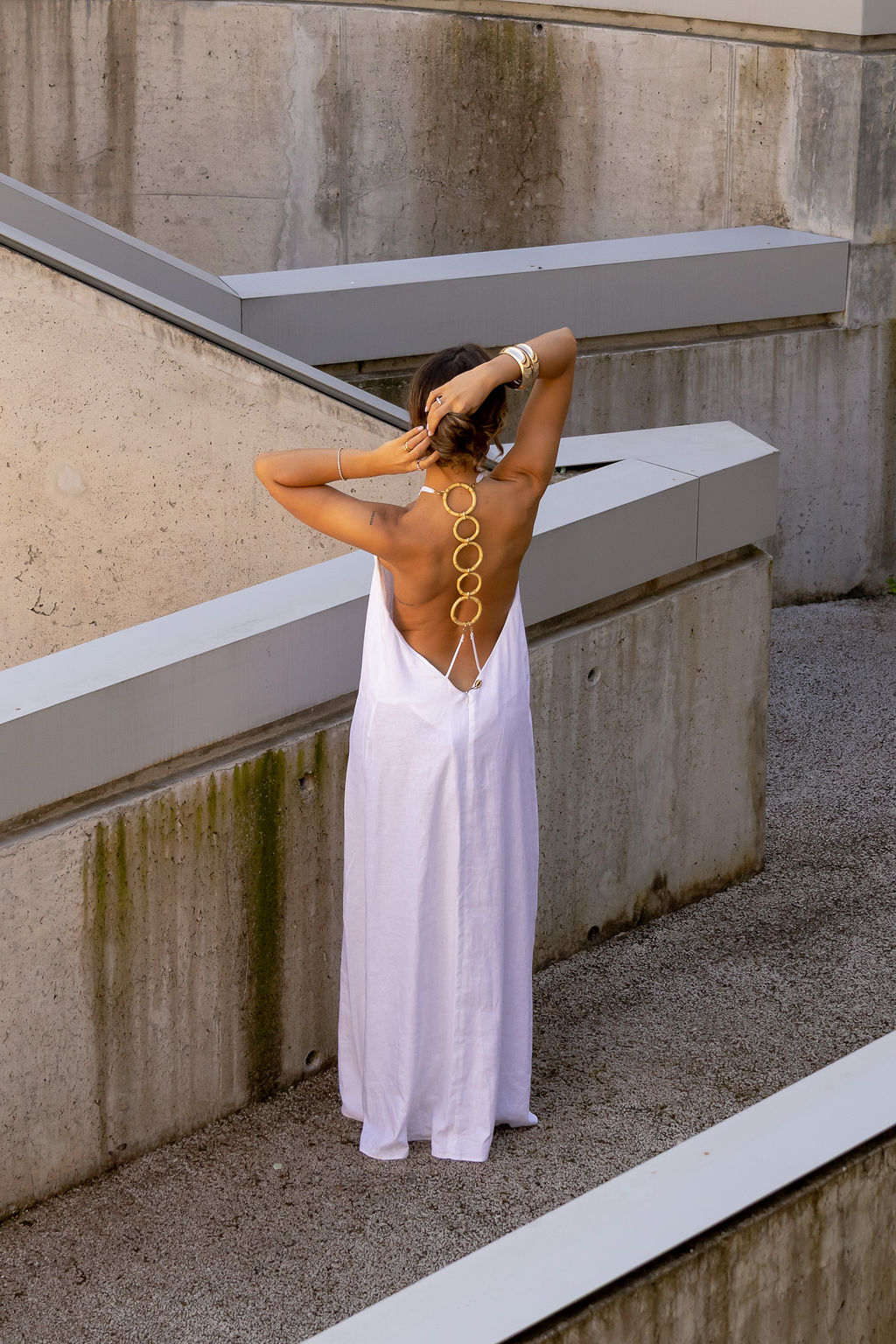 O design minimalista na frente é complementado por um detalhe diferenciador nas costas: uma sequência de argolas decorativas em efeito bambu que criam um visual marcante e elegante. As alças finas e o corte solto reforçam a leveza da peça, enquanto o movimento do tecido acompanha o corpo de forma natural.