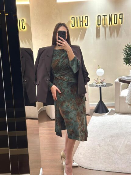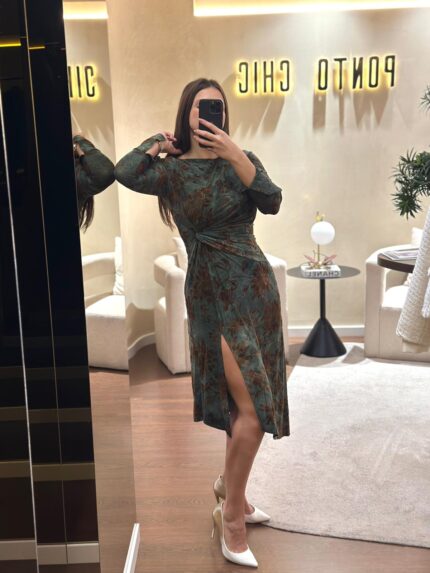 VESTIDO VERDE FLORAL COM ESTAMPADO CASTANHO E DETALHE DRAPEADO SAHOCO