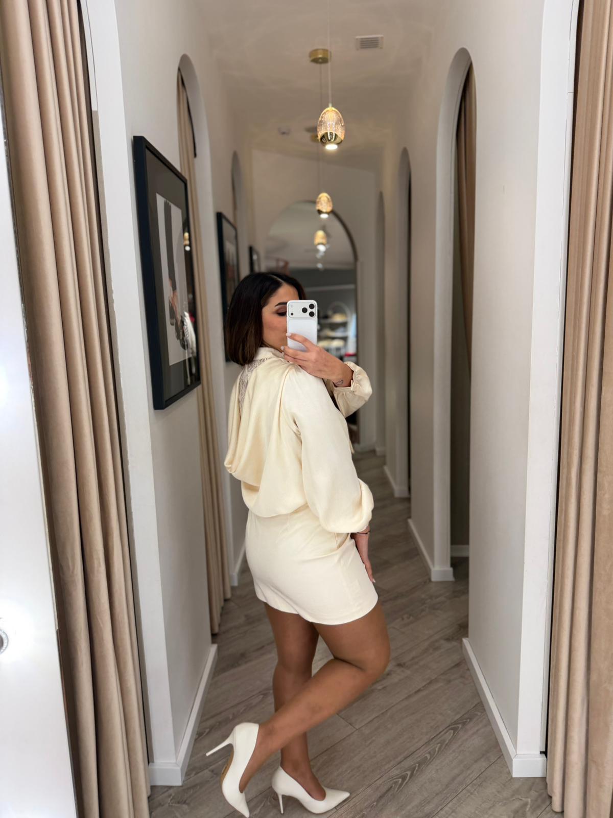 Vestido bege de corte elegante e feminino, com silhueta fluida na parte superior e estrutura mais definida na zona da saia, criando um equilíbrio sofisticado entre leveza e forma.