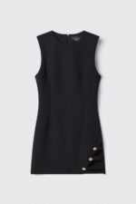 VESTIDO CURTO CAVEADO. COM PORMENOR DE PRESILHAS E APLICAÇÃO DE BOTÃO DOURADO NO FUNDO. 88% POLIÉSTER 12% ELASTANO