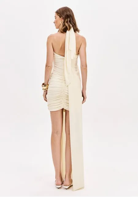 Este vestido curto da Lança Perfume destaca-se pelo seu design elegante e contemporâneo, onde a sobreposição fluida assume o papel principal, criando movimento e um efeito visual sofisticado. O decote halter valoriza a zona do colo, acrescentando feminilidade e modernidade à peça.