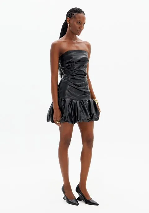 Este vestido curto em polipele preta da Lança Perfume é uma verdadeira afirmação de estilo e ousadia. O design em tecido efeito pele é enriquecido por drapeados estratégicos que criam movimento e valorizam a silhueta, conferindo um ar moderno e sedutor.