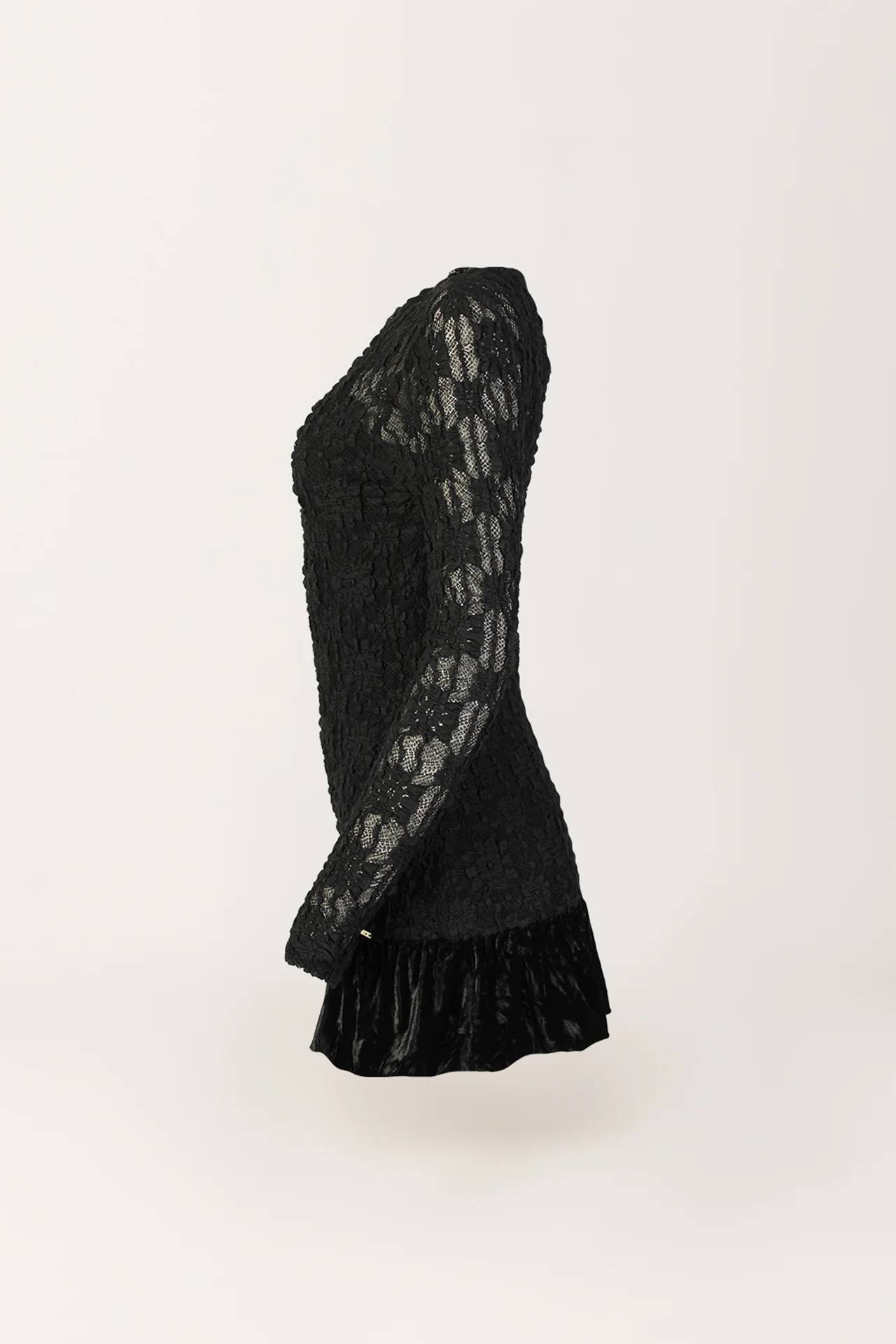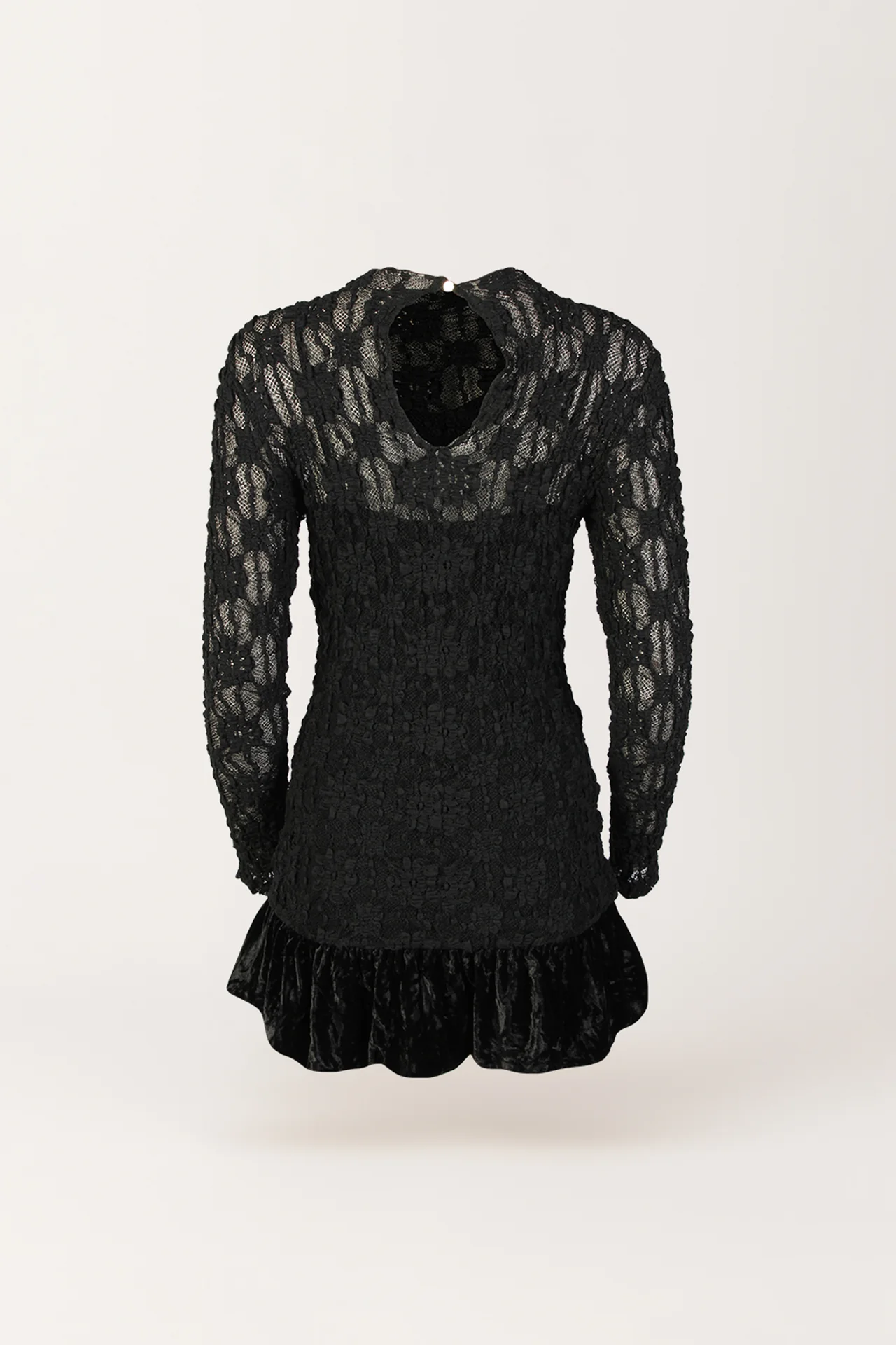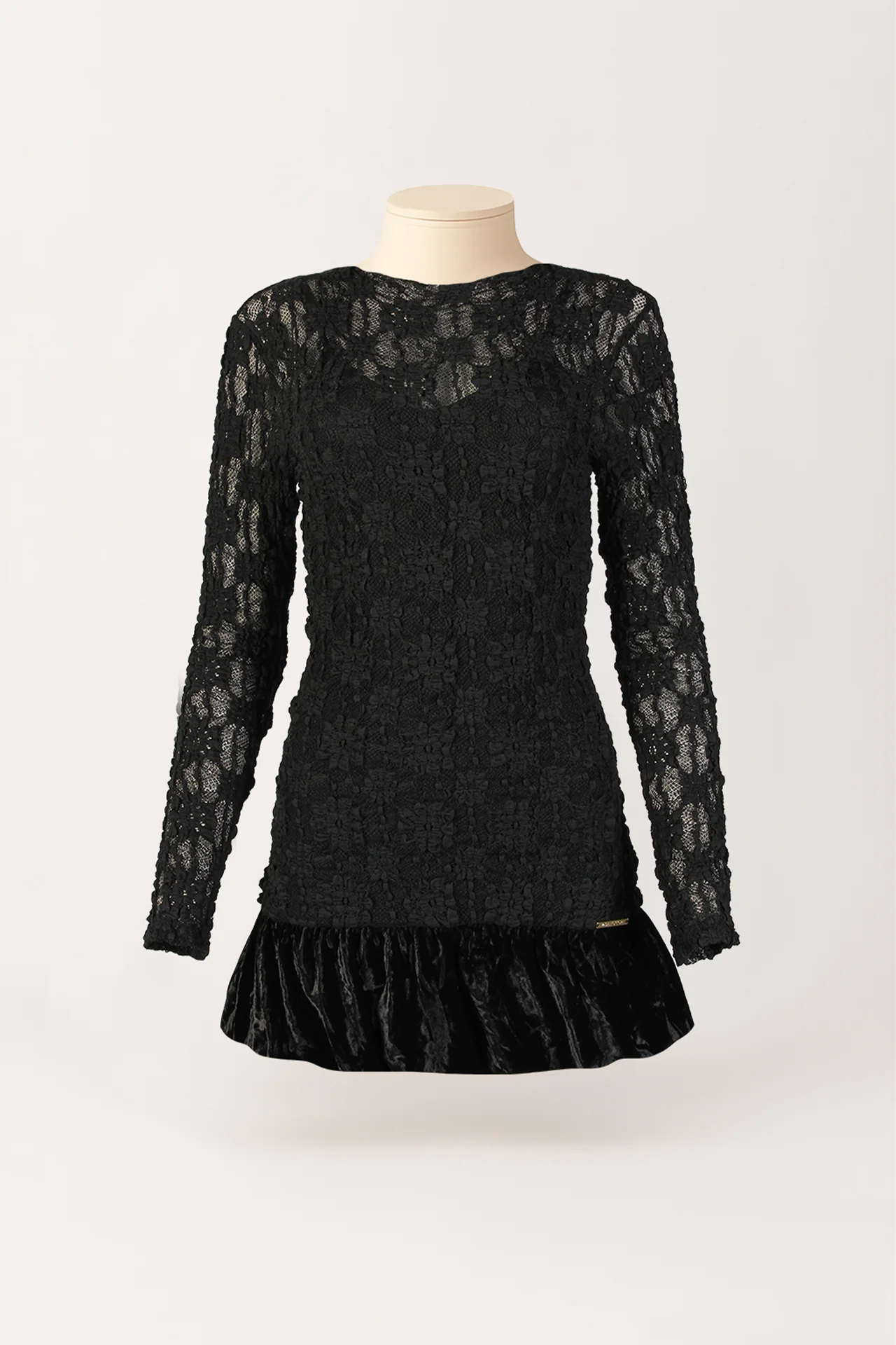 VESTIDO CURTO EM RENDA COM FOLHO EM VELUDO SAHOCO