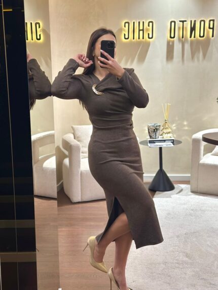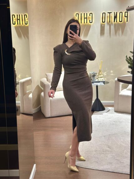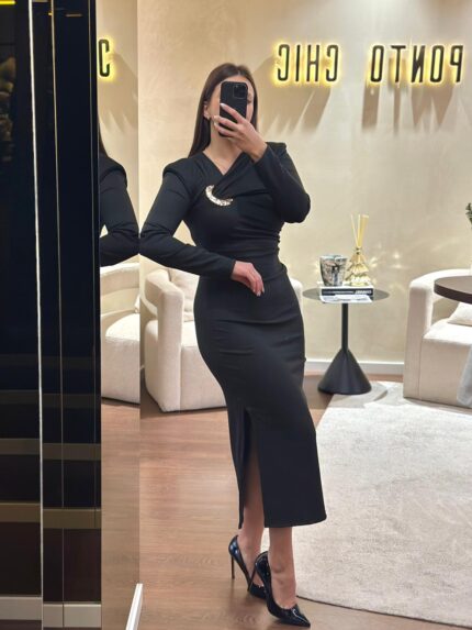 VESTIDO DRAPEADO COM FIVELA DOURADA BORDO PONTO CHIC