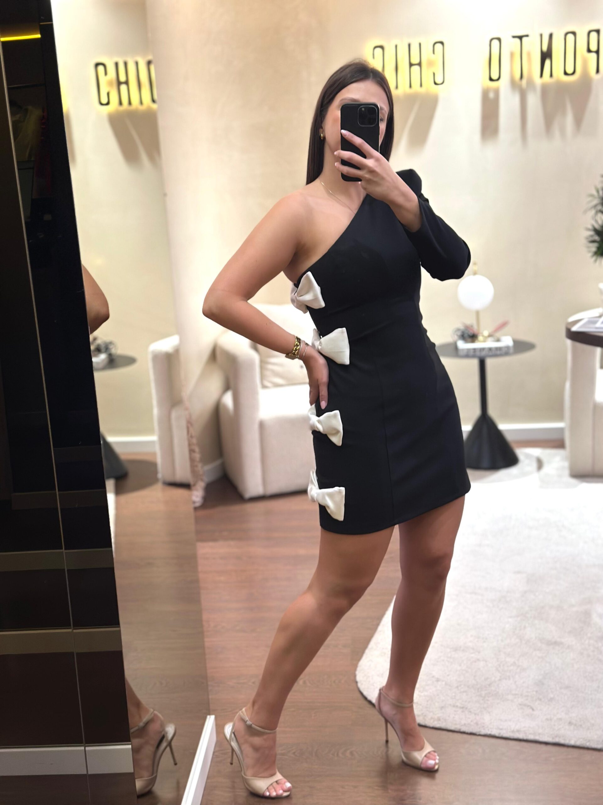 VESTIDO CURTO PRETO COM LAÇOS BRANCOS LANÇA PERFUME
