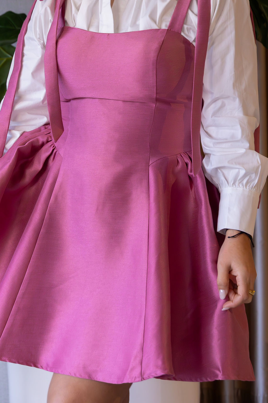 VESTIDO CURTO ROSA ACETINADO COM ALÇAS DE LAÇO PONTO CHIC