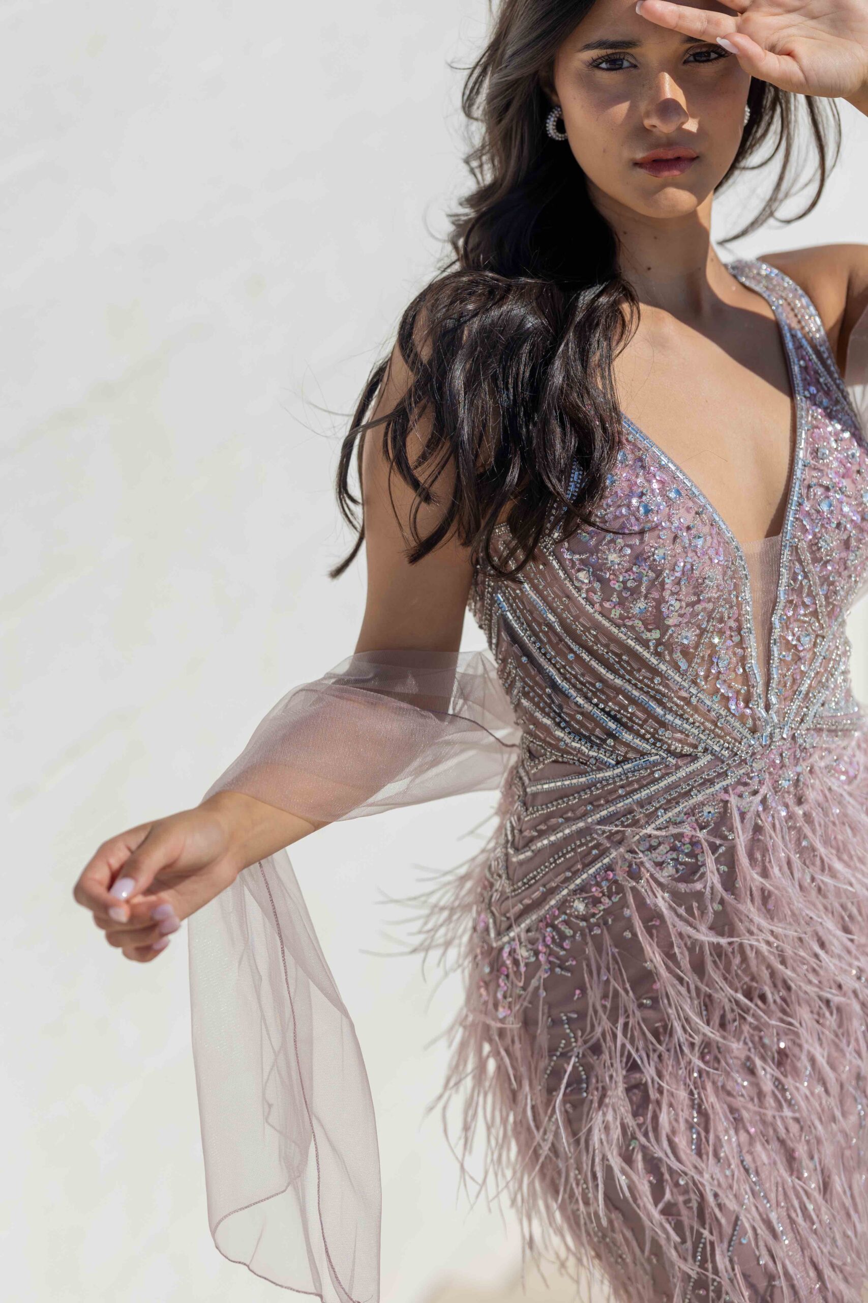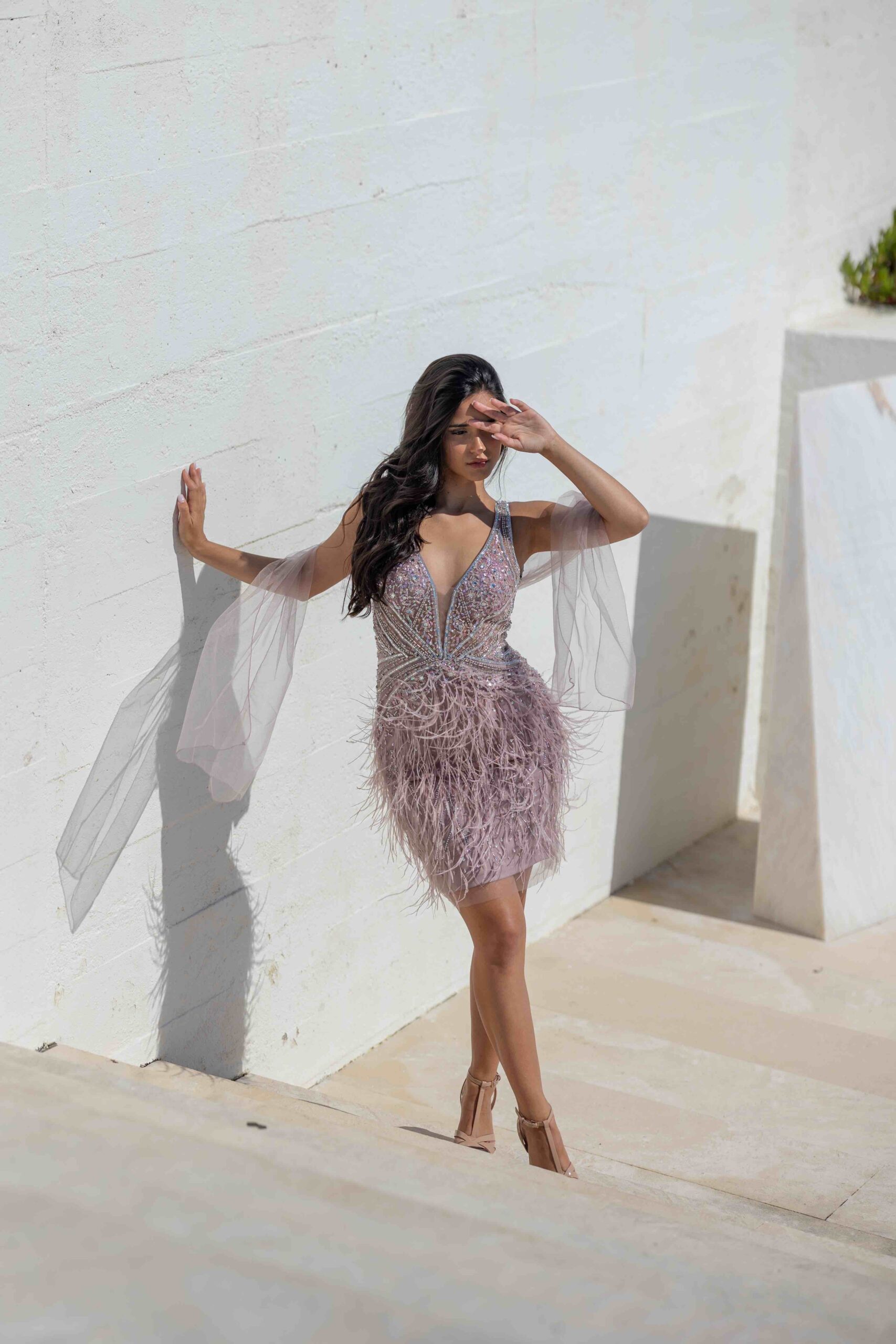 O corpo é trabalhado com bordados e aplicações brilhantes, criando textura e luminosidade, enquanto a saia curta termina com plumas suaves que acrescentam movimento e um toque glamoroso. O grande destaque está nas mangas longas em tule transparente, leves e esvoaçantes, que conferem um efeito dramático e ultra feminino ao andar.