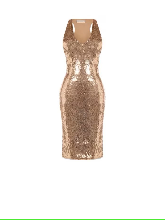 Totalmente coberto por lantejoulas em tom champagne, apresenta um decote em V profundo que alonga a silhueta e realça a feminilidade de forma subtil e sofisticada. O forro interno macio assegura conforto durante todo o uso, mesmo em eventos prolongados.