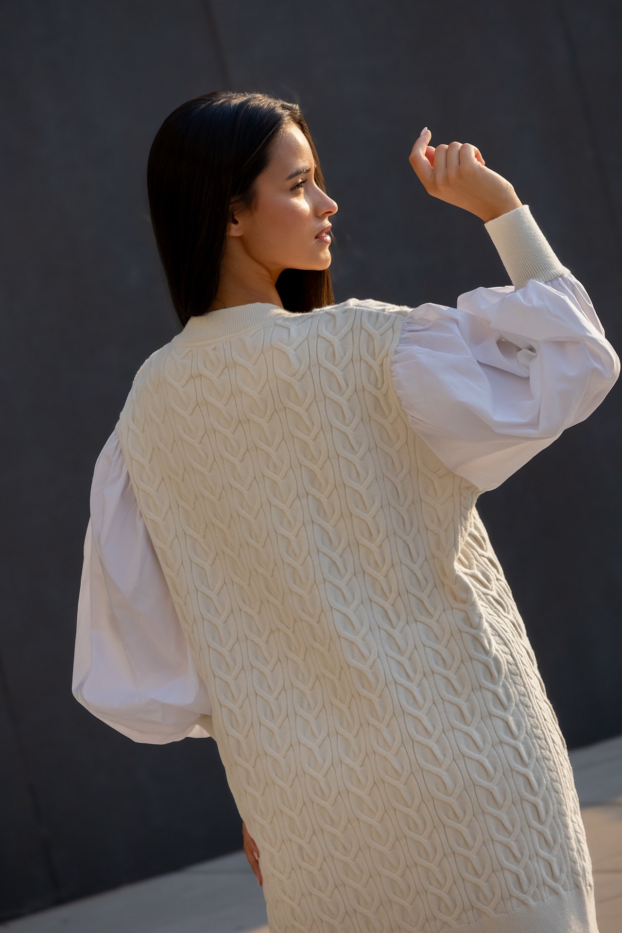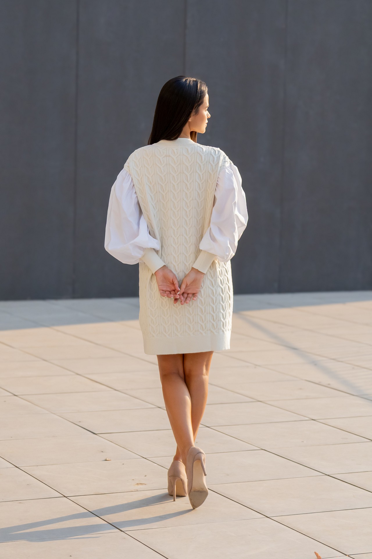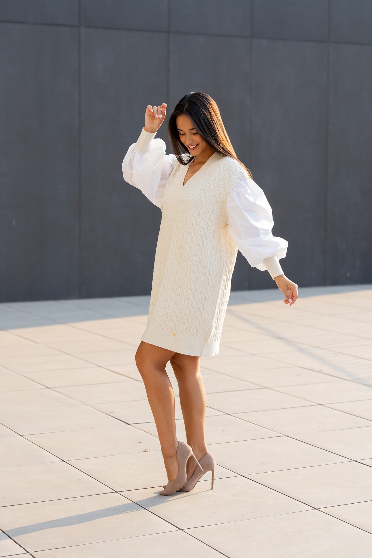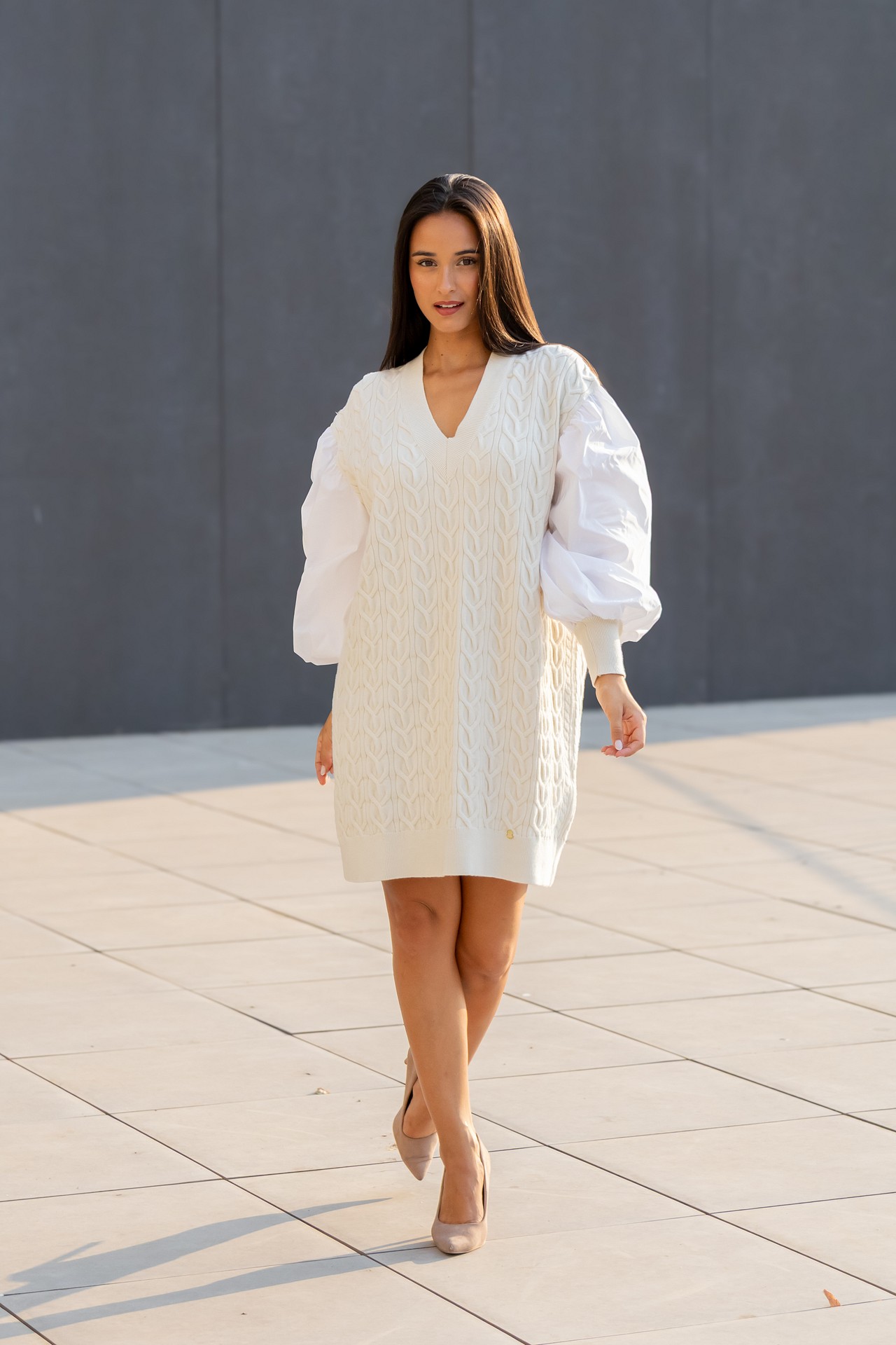 Vestido com malha trançada. Decote em V na frente. Mangas em tecido abalonadas com punho em rib em malha no fundo. Composição: 50% Viscose 28% Poliéster 22% Poliamida