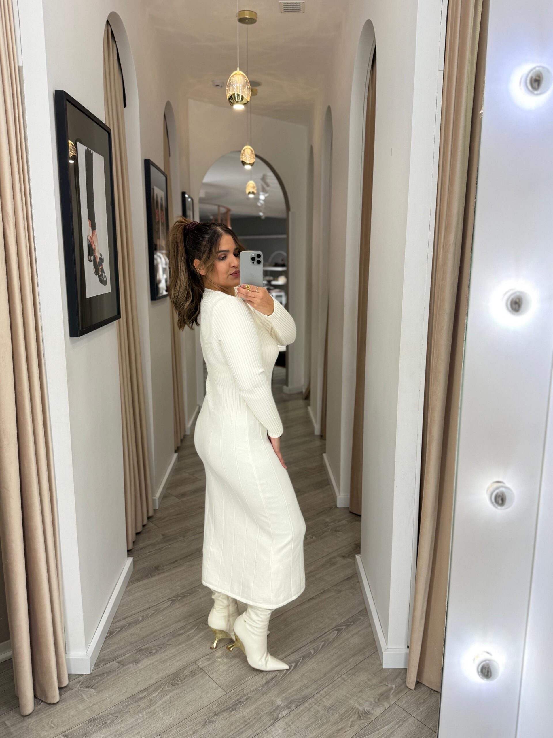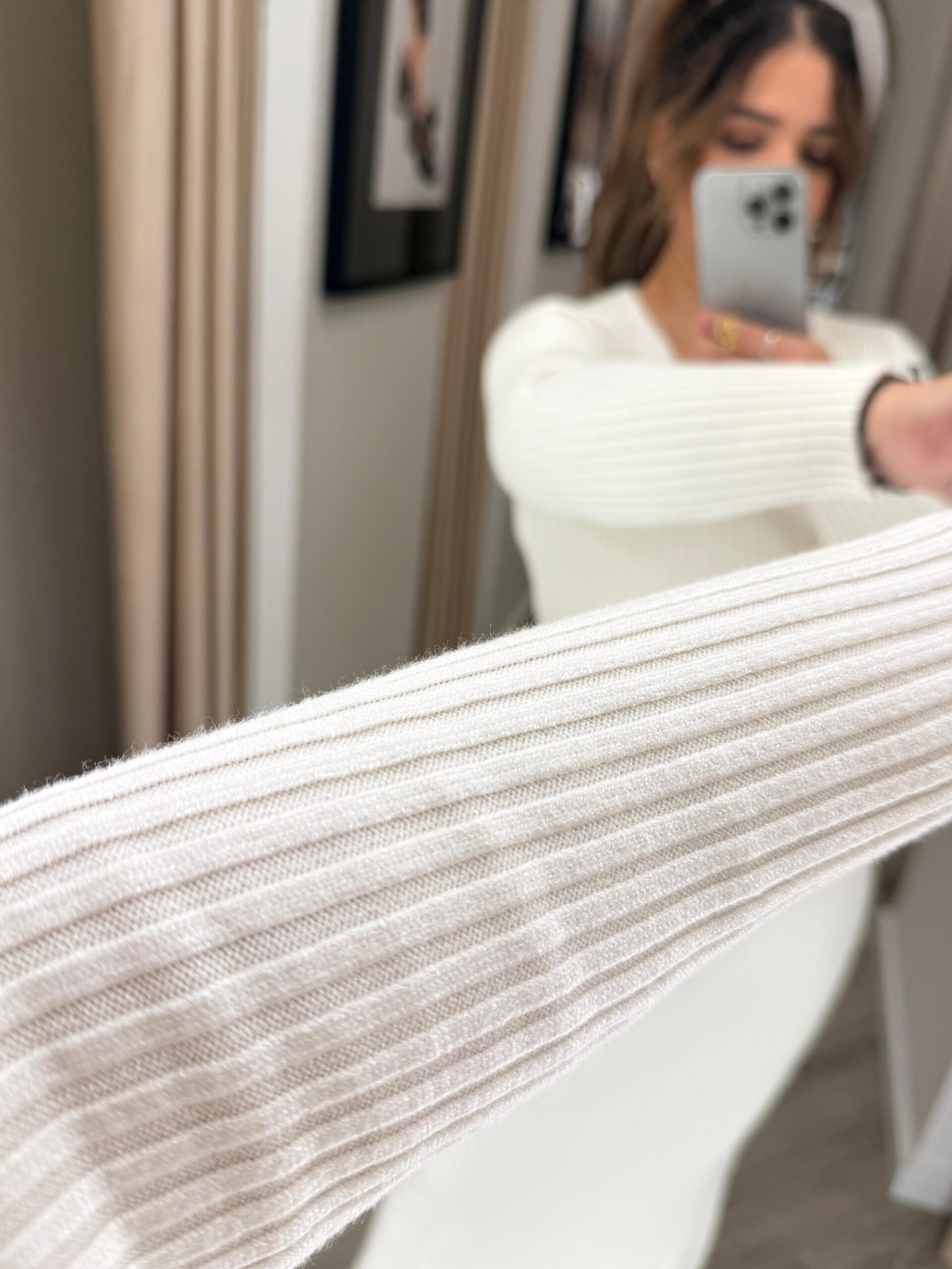 Versátil e confortável, o vestido de malha cru Ponto Chic é uma aposta segura para looks de outono e inverno — elegante, feminino e fácil de combinar com botas, casacos longos ou acessórios de destaque.