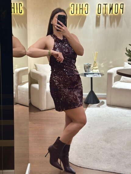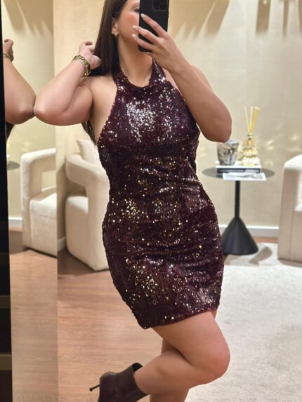 €54.90VESTIDO BORDÔ DE LANTEJOULAS COM LAÇO NO PESCOÇO PONTO CHIC