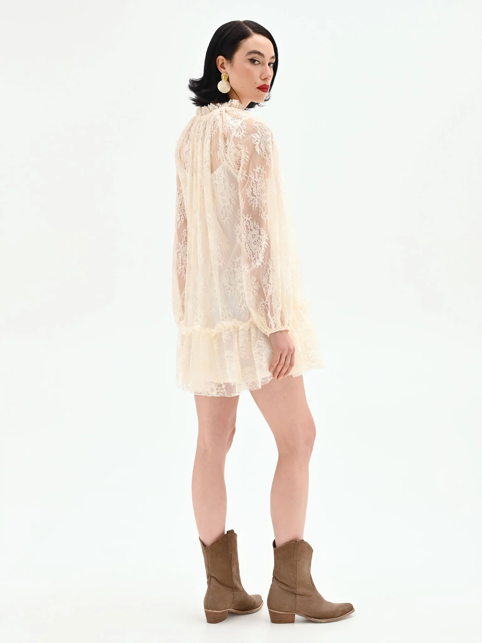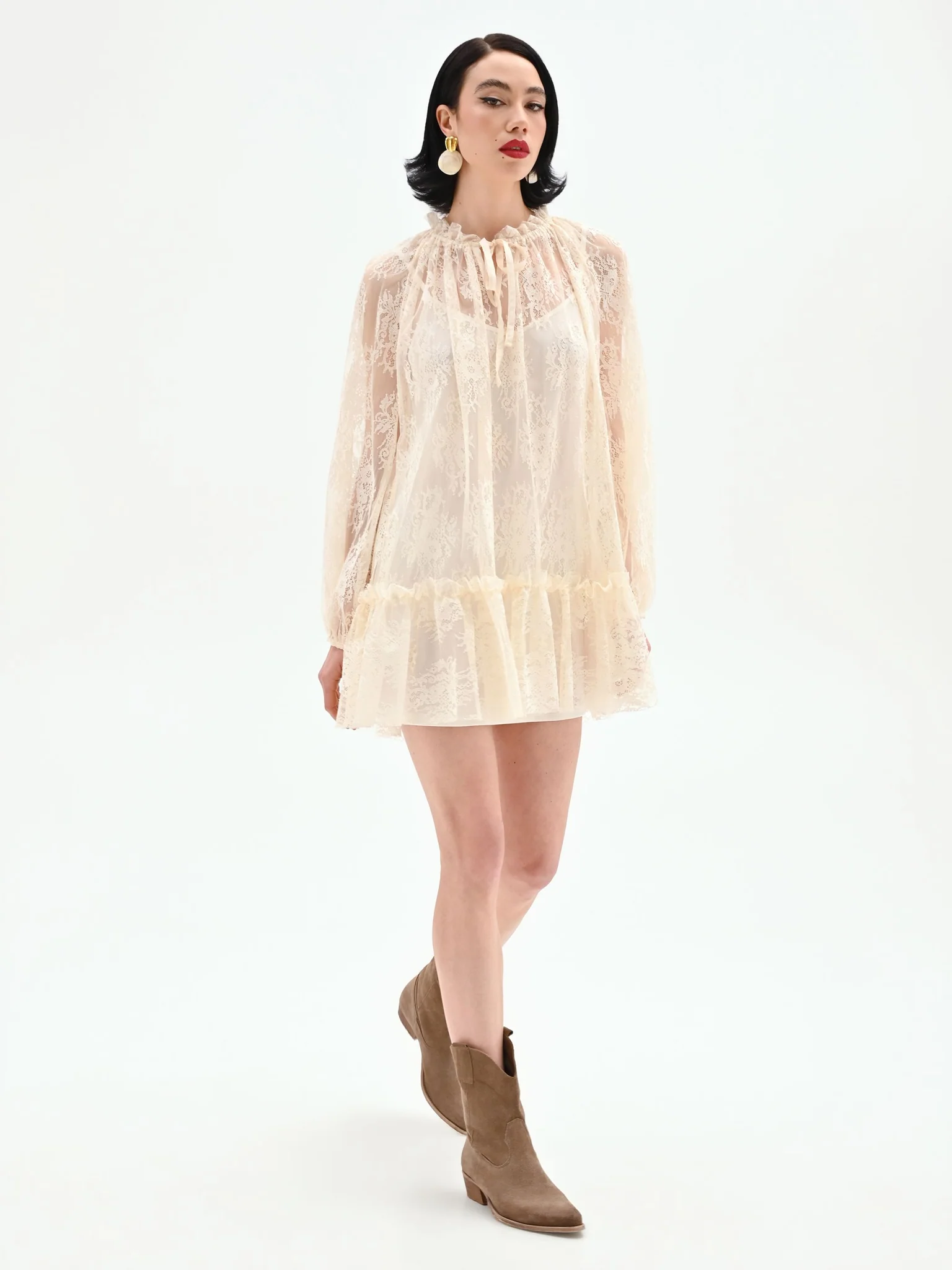 Romântico, delicado e absolutamente marcante. Este vestido em renda bege destaca-se pela transparência subtil e pelo jogo de texturas que cria um efeito leve e etéreo sobre o corpo.