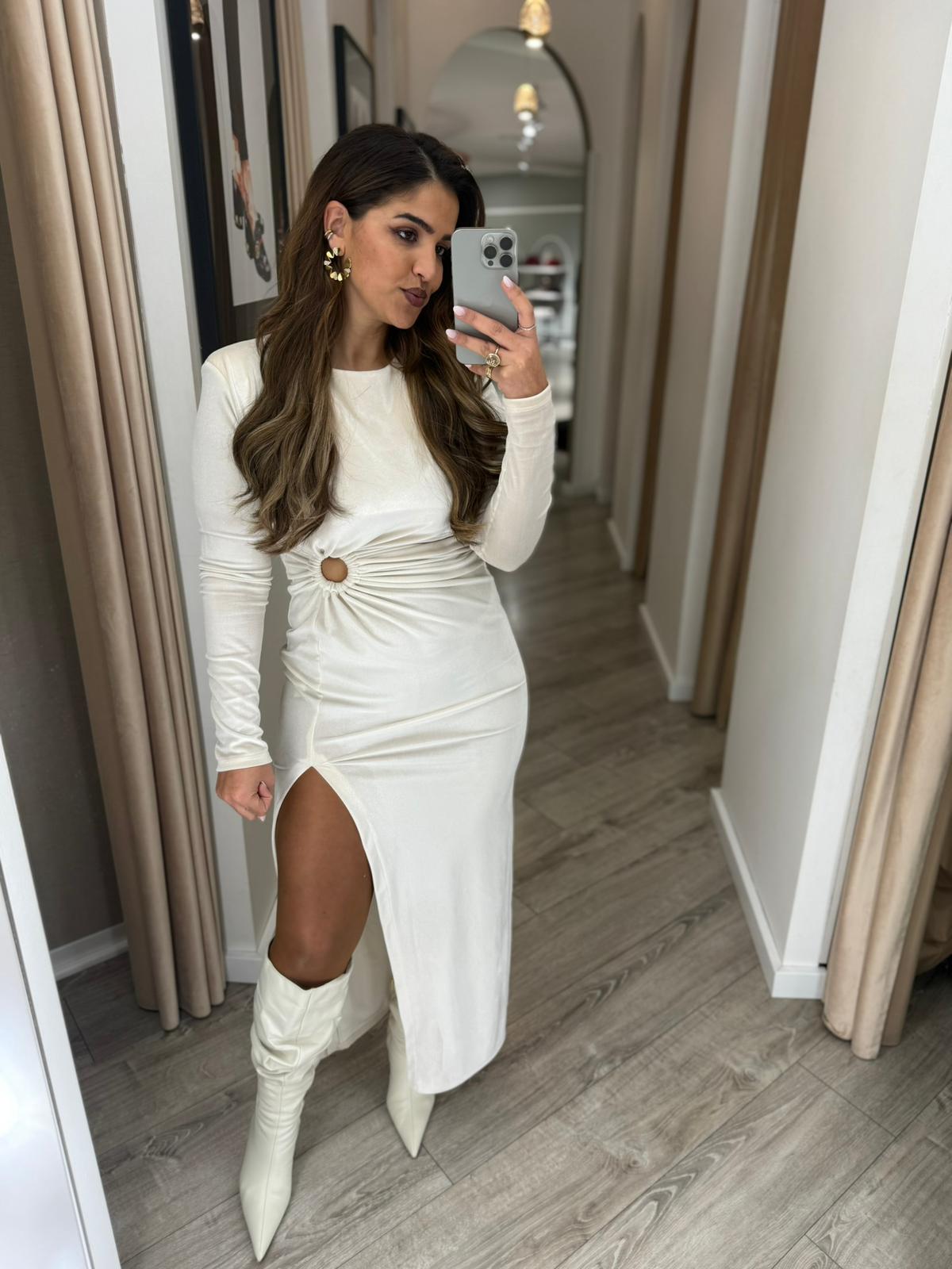 O design destaca-se pelo drapeado frontal com argola decorativa, posicionada de forma estratégica para valorizar a silhueta e criar um efeito visual marcante. A gola redonda e as mangas compridas equilibram o carácter sensual do detalhe frontal com uma estética elegante e contemporânea, enquanto o corte fluido acompanha naturalmente os movimentos.