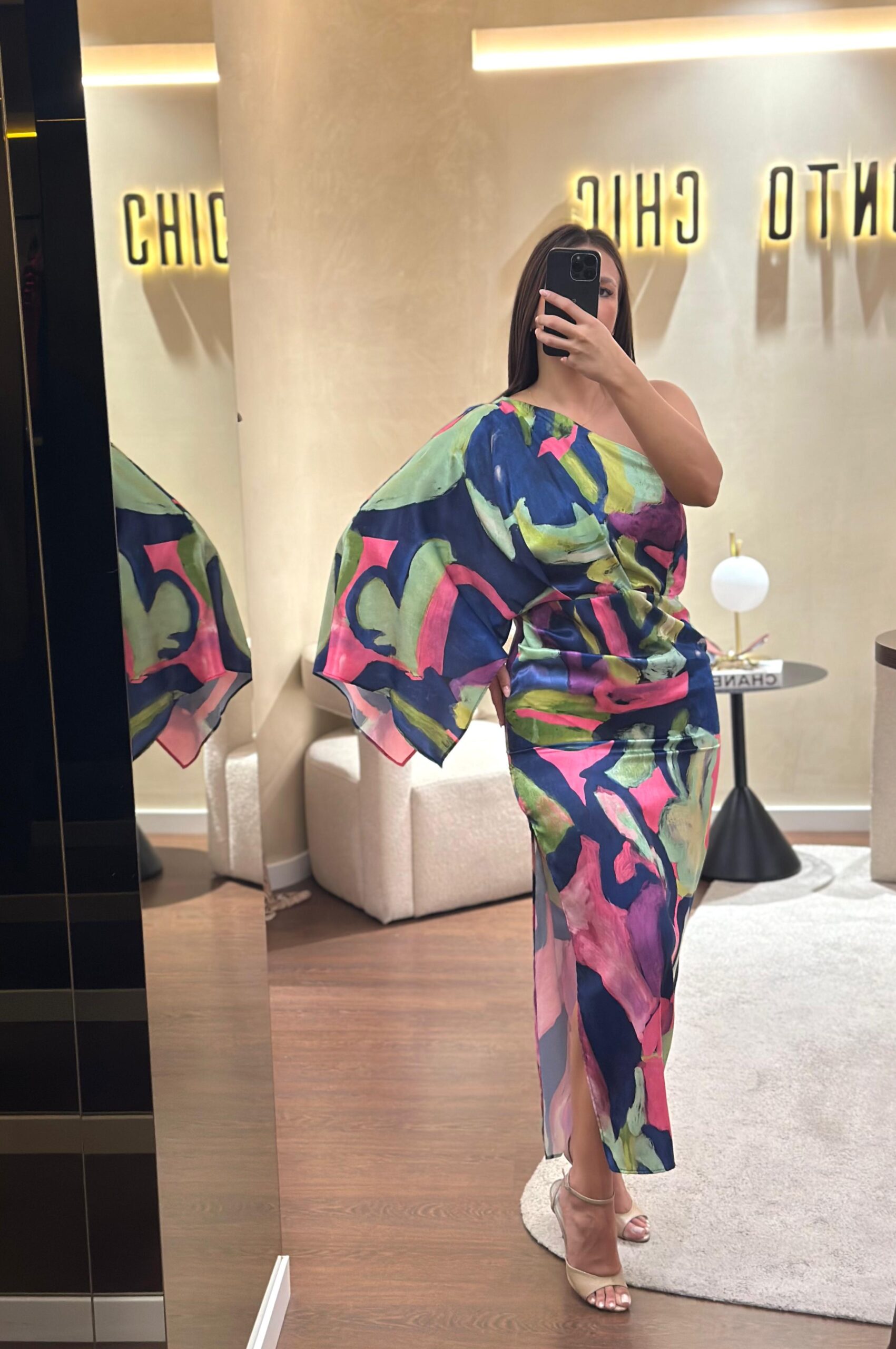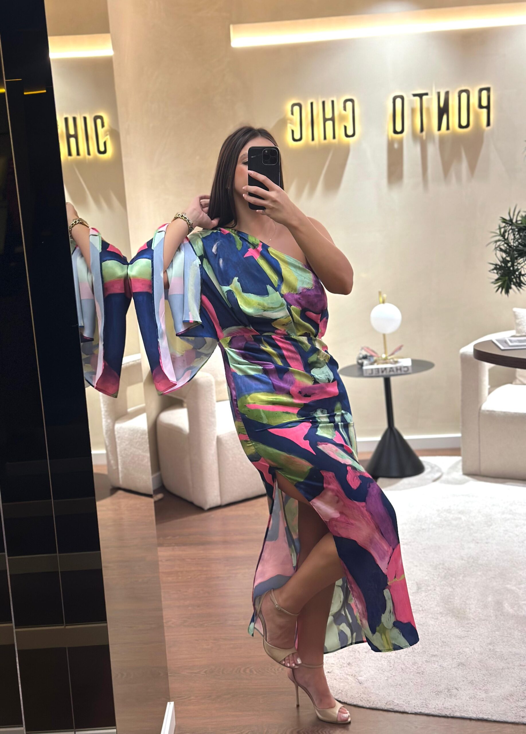 VESTIDO ESTAMPADO MANGA UNILATERAL PONTO CHIC