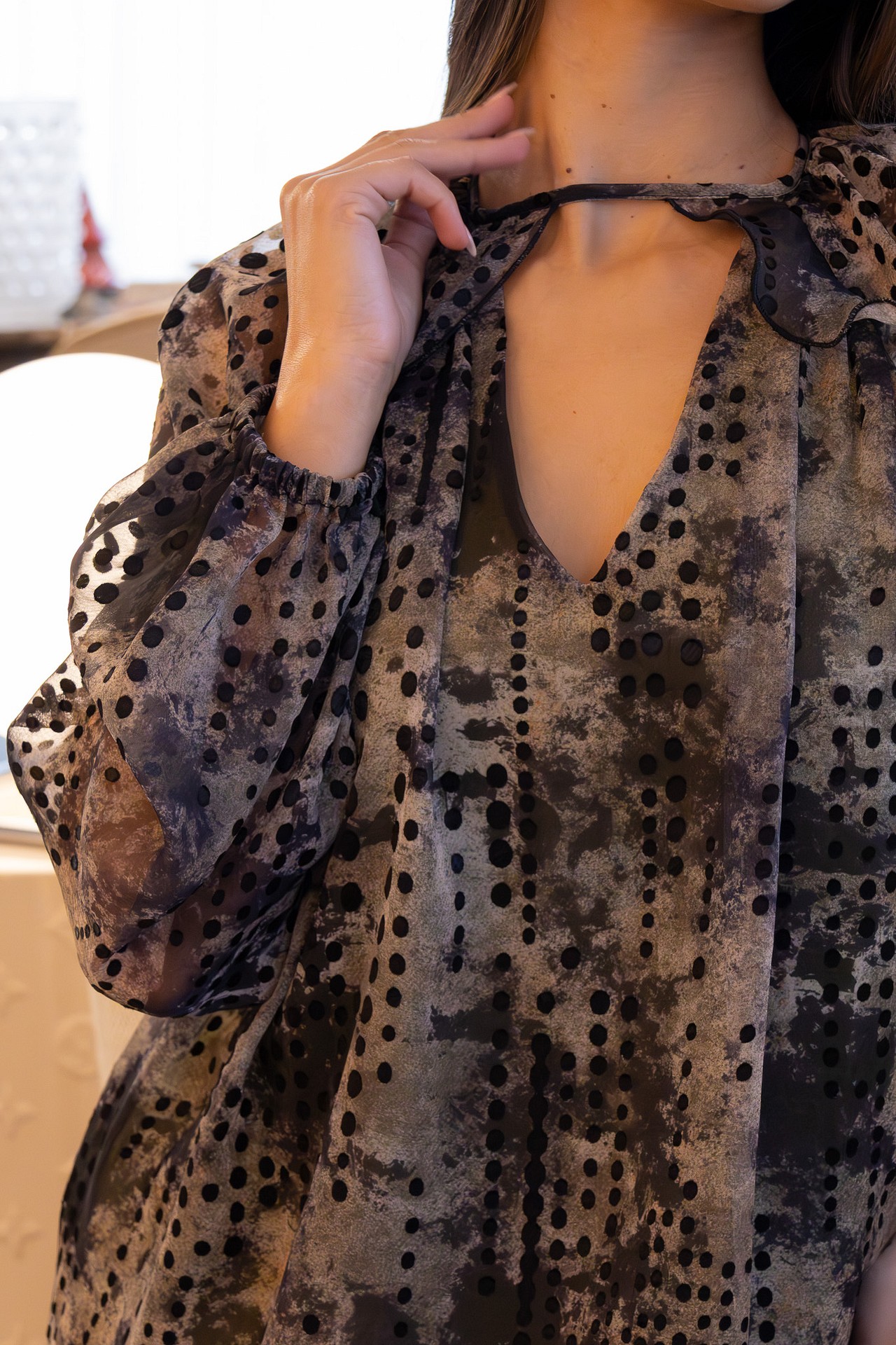 O vestido Sahoco apresenta uma estampa abstrata em tons de cinza e preto com detalhes de pequenas transparências em círculos que criam um efeito moderno e sofisticado. O corte fluido garante movimento e leveza, ideal para um look impactante.