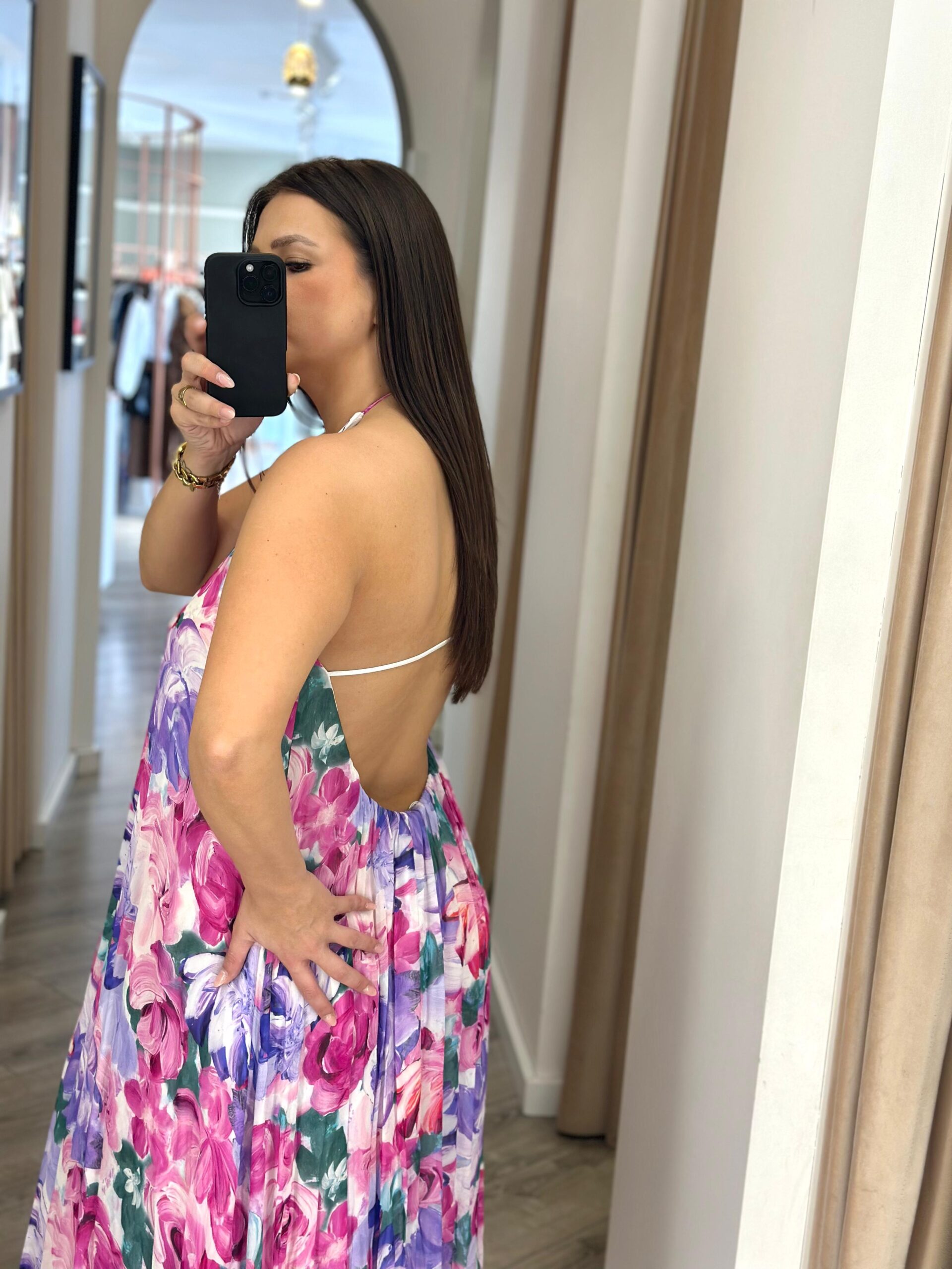 Com design comprido e decote halter com amarração ao pescoço, este vestido destaca-se pelo padrão floral vibrante em tons de rosa, lilás e verde, criando um visual sofisticado e cheio de energia. O corte esvoaçante da saia reforça a feminilidade e garante conforto em qualquer ocasião.