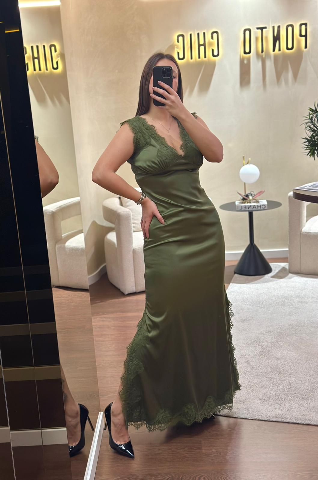 VESTIDO KAKI CETIM COM RENDA NO SECRETS