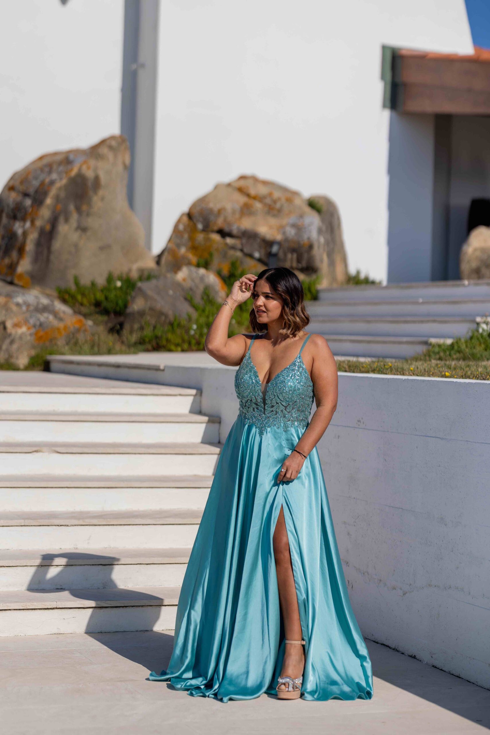 Vestido longo em tom azul claro, leve e luminoso, pensado para cerimónias e eventos especiais onde a elegância se alia à delicadeza. O modelo apresenta decote profundo em V que valoriza o colo de forma feminina e harmoniosa.